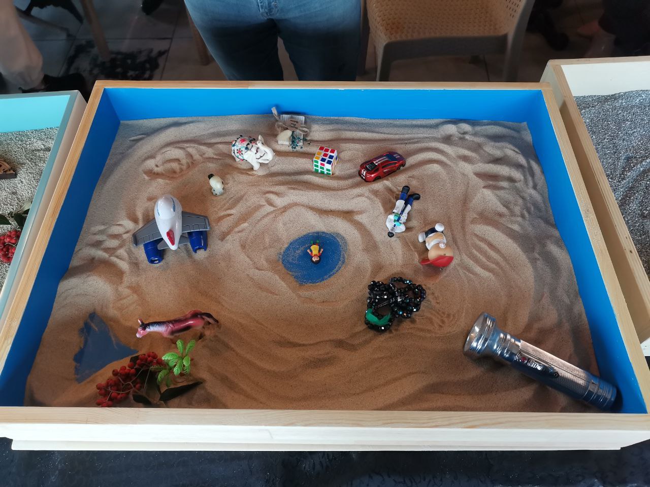 Gökyüzü veya suyu temsil eden mavi boyalı kum tepsileri ve yüzlerce minyatürün kullanıldığı terapide Sezen Cavuldak, bu minyatürlerin danışanın hayat öyküsünü yansıttığını belirtti.