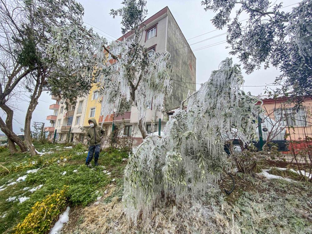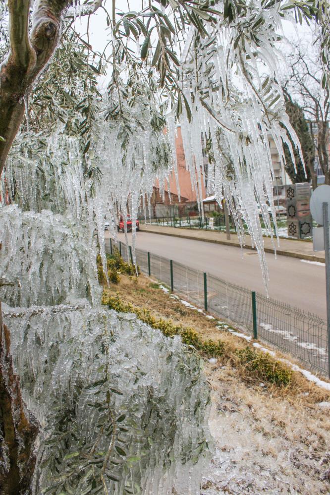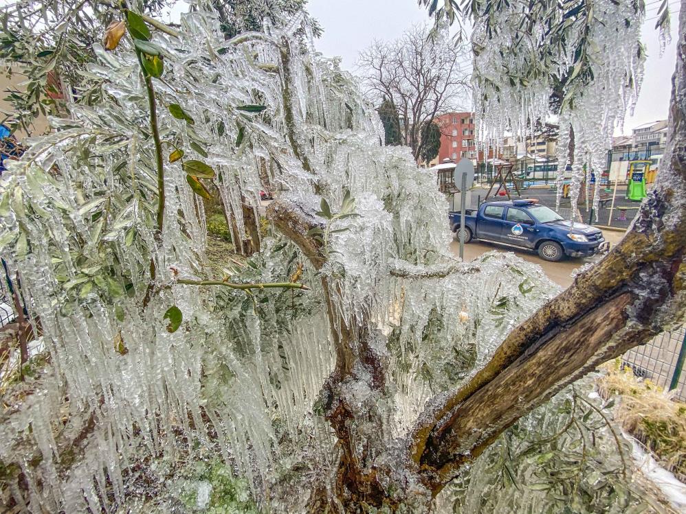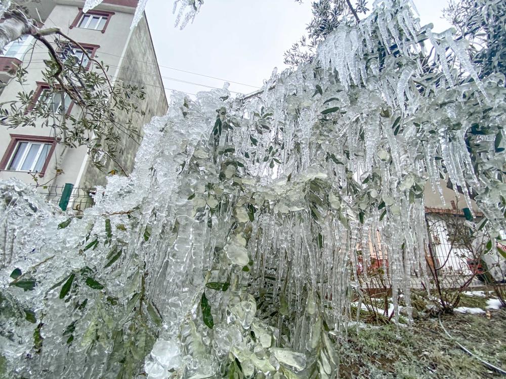 Mecidiye Mahallesi’ndeki bir evin patlayan bahçe hortumunundan fışkıran su, zeytin ağaçlarında sarkıtlar oluşturdu.