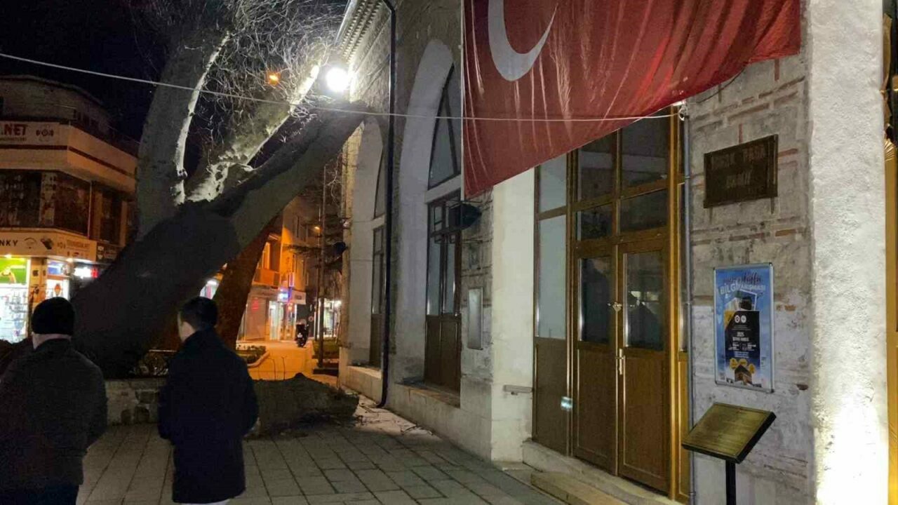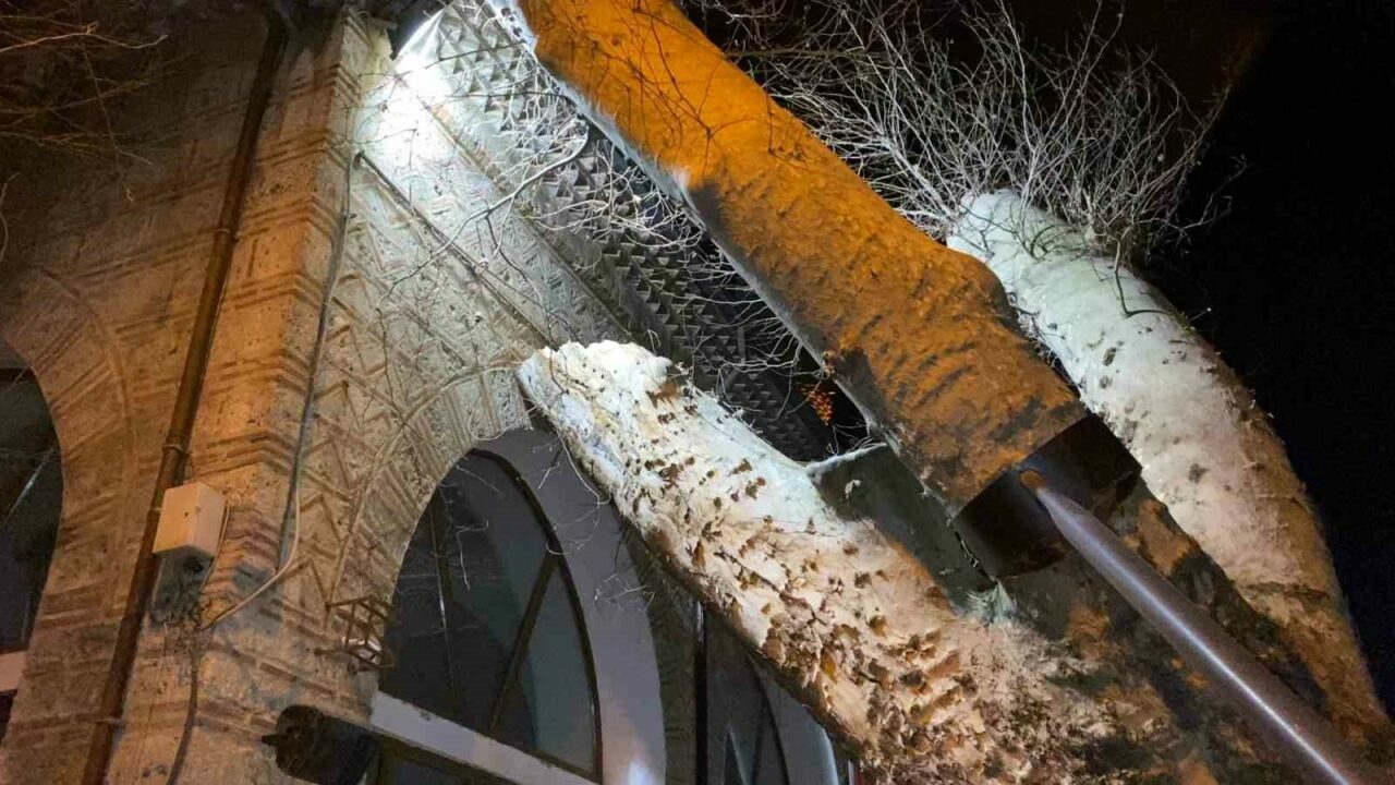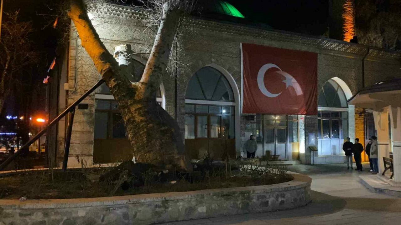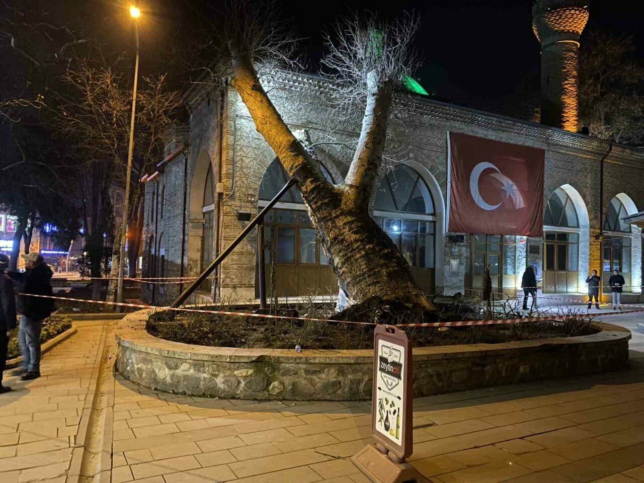 600 yıllık İshakpaşa Camii’nin girişinde bulunan asırlık çınar ağacı kökünden çıkarak devrildi.