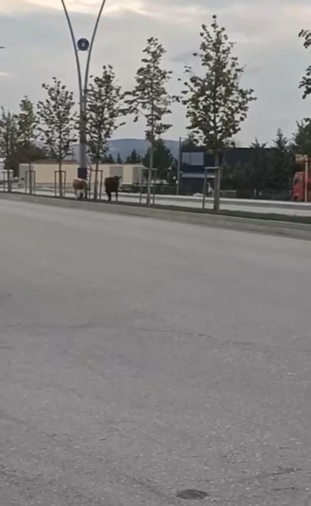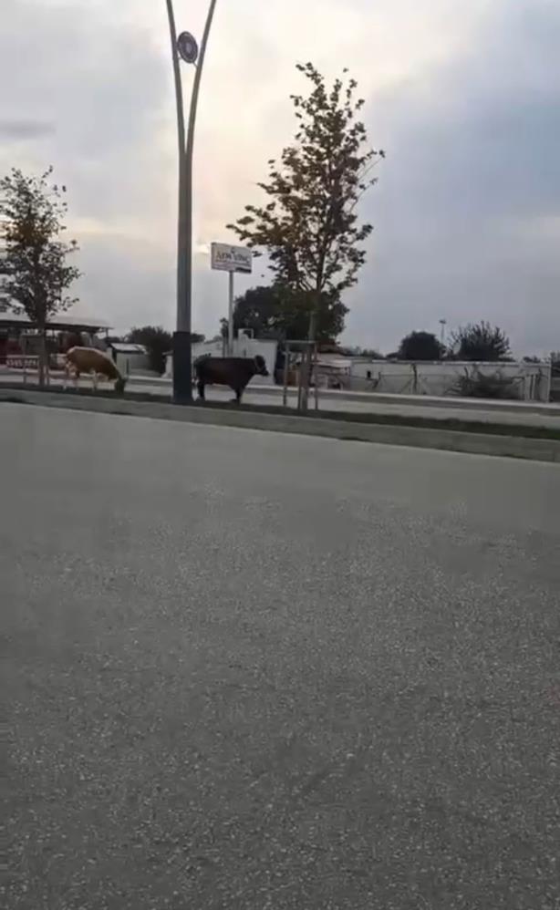 Başıboş ve nereden kaçtığı öğrenilemeyen 2 inek, yol ortasında bulunan refüj üzerinde seyretmeye başladı.