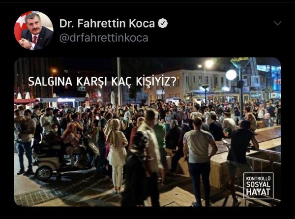 Bakan Koca, Mudanya ilçesindeki sahilden, sosyal mesafe ve maske kuralına uymayan kişilerin fotoğrafını ‘Salgına karşı kaç kişiyiz?’ notuyla paylaşmıştı.