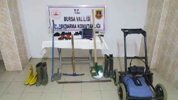 1 radar cihazı, 2 kazma, 1 kürek, 1 manivela, 1 testere ve 2 demir şiş ele geçirildi. Şüpheliler hakkında kaçak kazı yapmak suçundan işlem başlatıldı.