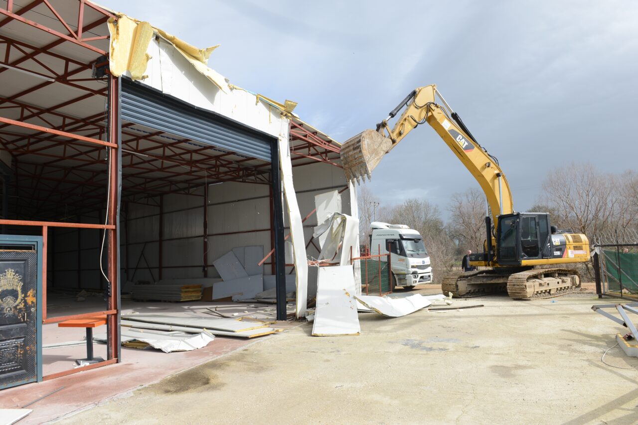 Yıkım programına alınan ilk yer, fabrika olarak kullanılan 600 metrekarelik bir yapı oldu. Yıkım öncesinde, işletme sahibinin mağduriyet yaşamaması adına içeride bulunan makine ve üretim ekipmanları titizlikle tahliye edildi. Malzemelerin zarar görmemesi için alınan önlemlerin ardından iş makineleri devreye girdi ve yapının yıkımı gerçekleştirildi.