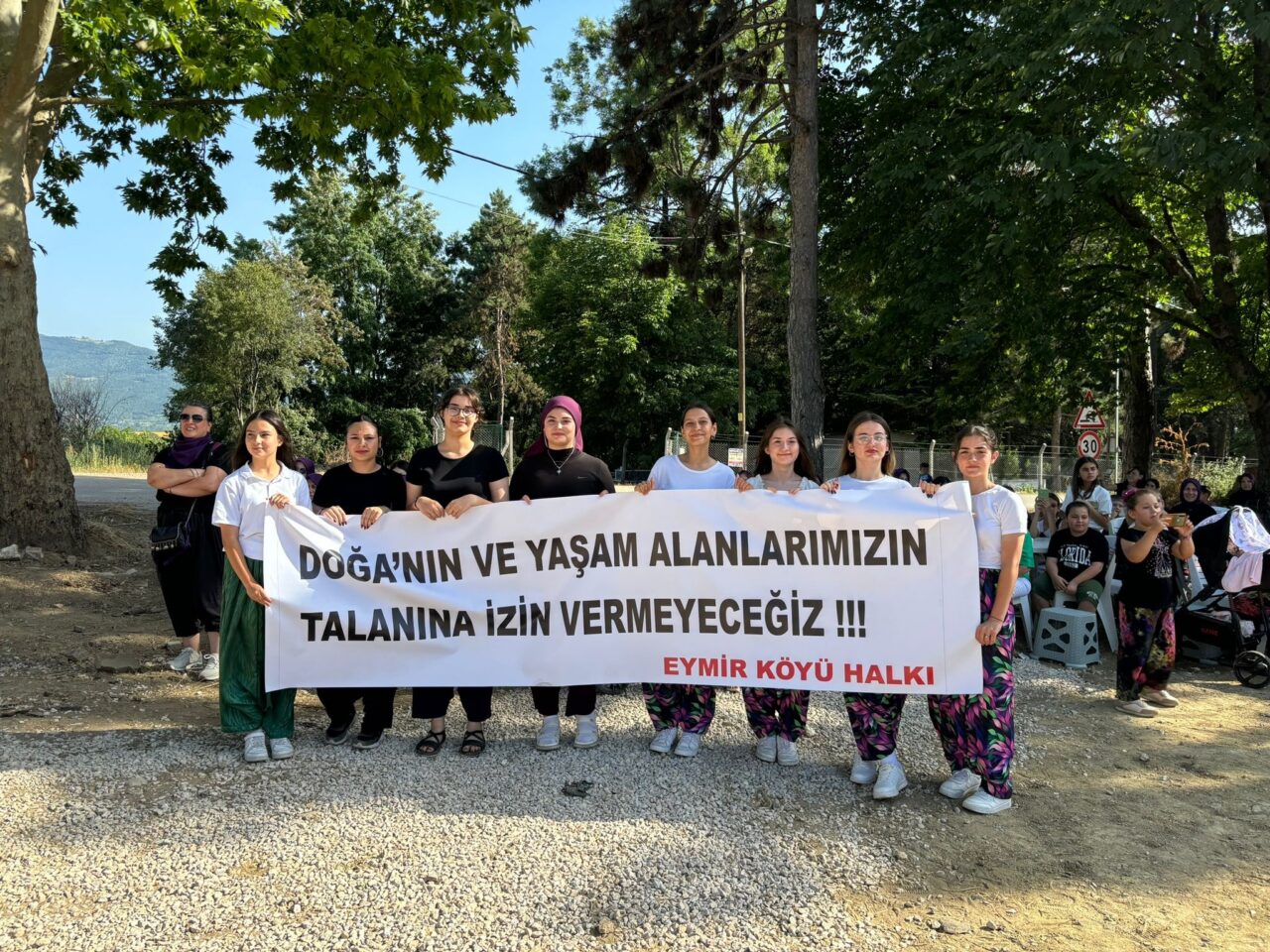 Eymir İlkokulu bahçesinde toplanan 300 kadın, ellerindeki pankartlarla, altın aramasında siyanür kullanılmasına tepki gösterdi.