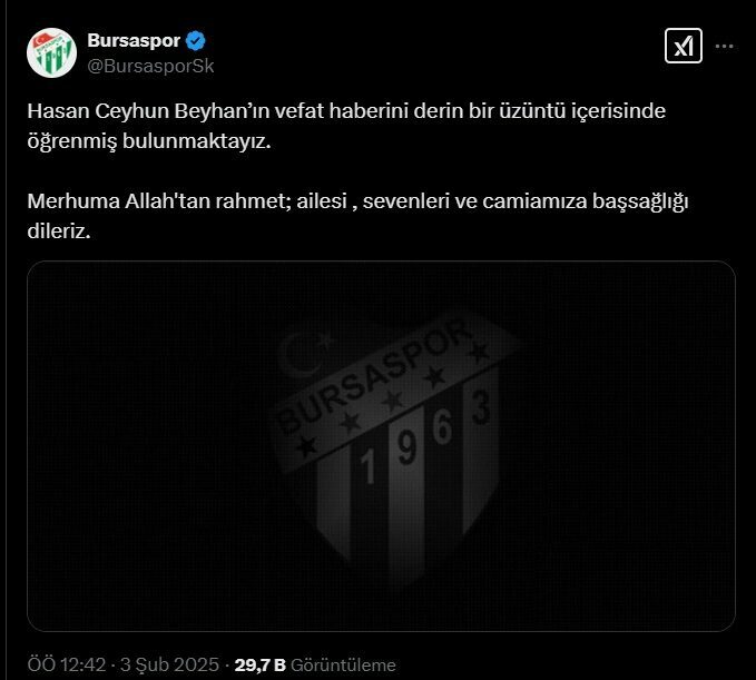 Hasan Ceyhun Beyhan’ın ölümünün ardından fanatik taraftarı olduğu Bursaspor’un sosyal medya hesabından da baş sağlığı mesajı yayınlandı. Mesajda, “Hasan Ceyhun Beyhan’ın vefat haberini derin bir üzüntü içerisinde öğrenmiş bulunmaktayız. Merhuma Allah’tan rahmet; ailesi, sevenleri ve camiamıza baş sağlığı dileriz” denildi. (DHA)
