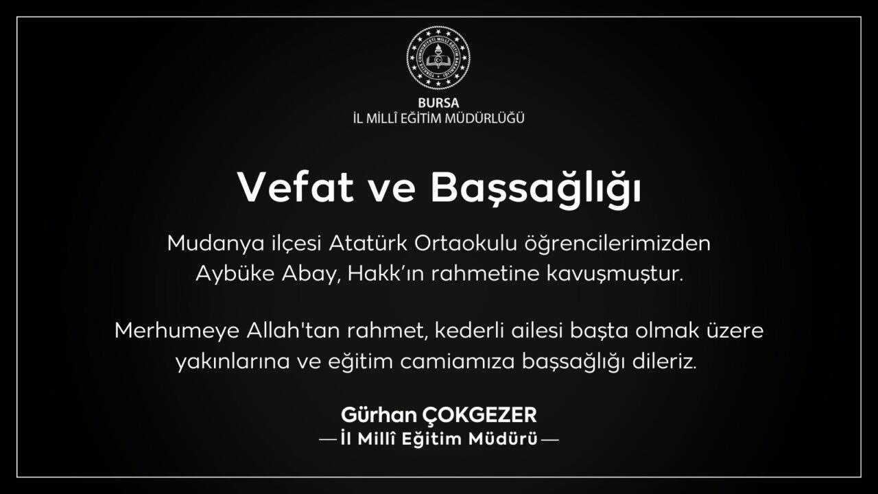 İl Milli Eğitim Müdürü Gürhan Çokgezer’in imzasıyla yayınlanan taziye mesajında, Mudanya ilçesindeki Atatürk Ortaokulu öğrencisi Aybüke Abay’ın yaşamını yitirdiği açıklandı.