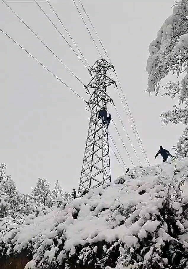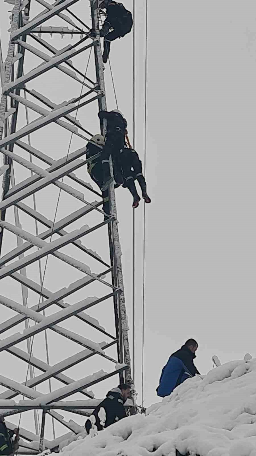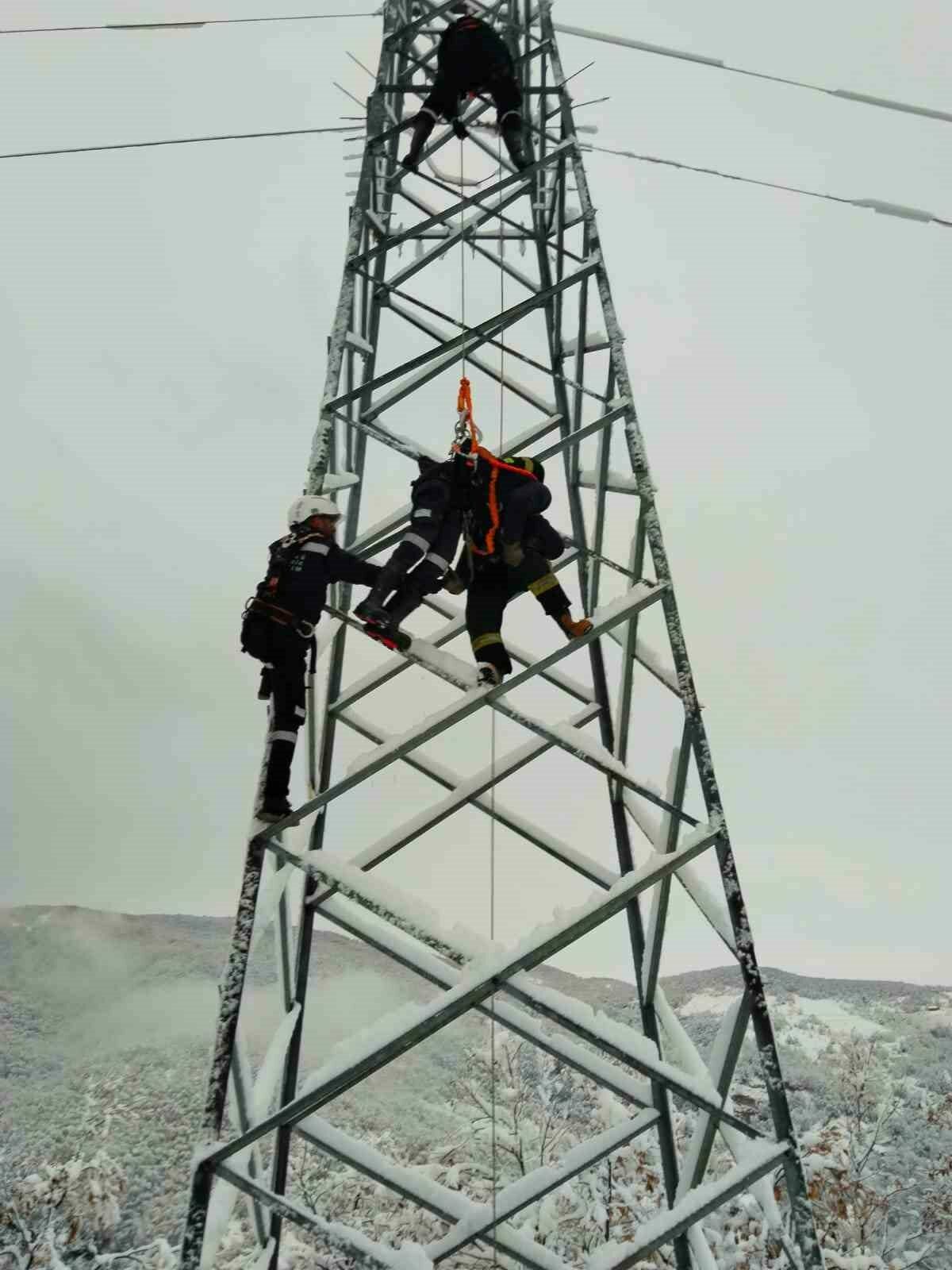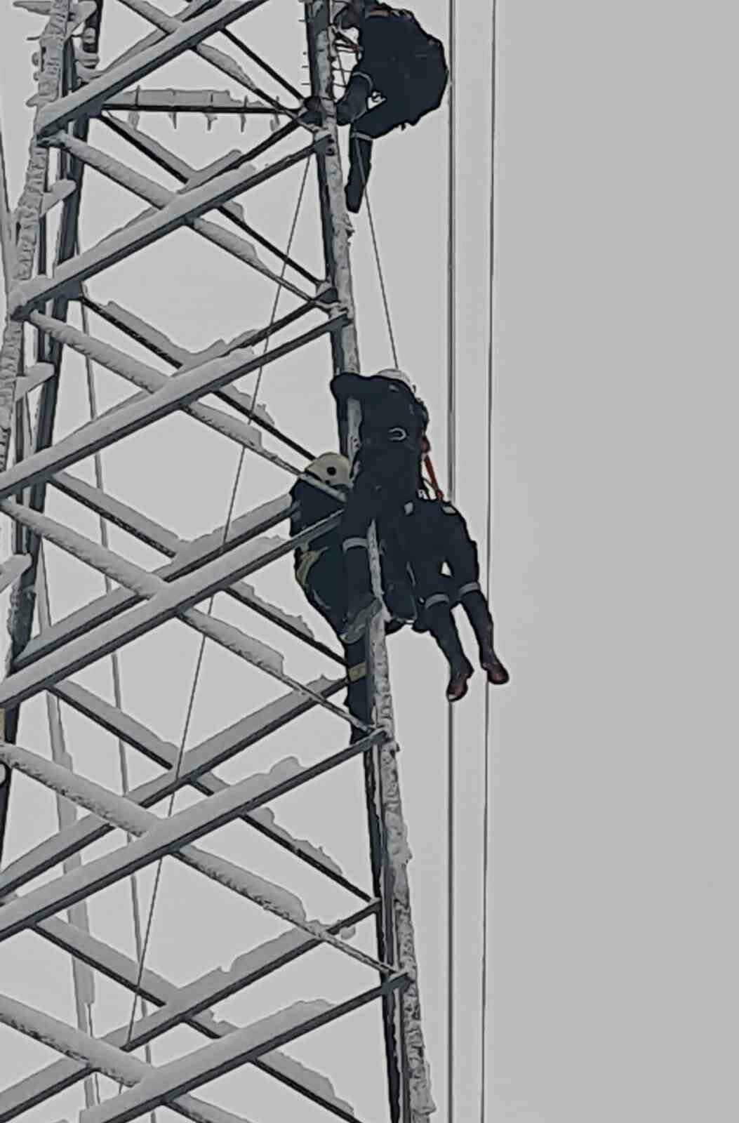 Enerji nakil hattı direğine tırmanan tekniker, arızayı gidermeye çalıştığı sırada akıma kapılarak direkte asılı kaldı.