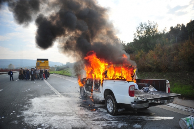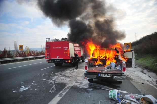 Olay, Bursa Çevre Yolu’nda meydana geldi. Kestel İlçesi’ne boya yapmaya giden 3 kişinin içinde bulunduğu 16 FP 744 plakalı kamyonetin motor bölümünde yangın çıktı.