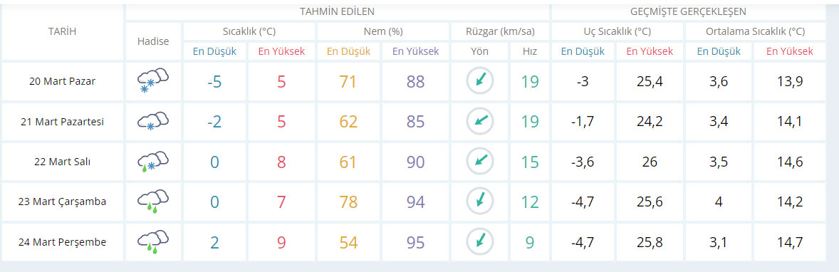 Ülkemiz genelinin parçalı ve çok bulutlu, Marmara’nın güney ve doğusu, Karadeniz, İç Anadolu’nun güney ve doğusu, Doğu Anadolu’nun kuzey ve doğusu ile Kırklareli, Tekirdağ, Kütahya ve Siirt çevrelerinin karla karışık yağmur ve kar yağışlı geçeceği tahmin ediliyor. Yağışların; sabah saatlerinde Kastamonu kıyıları, Sinop ve Samsun çevrelerinde, öğle saatlerinde ise Ordu çevrelerinde kuvvetli ve yer yer yoğun kar şeklinde olması bekleniyor.