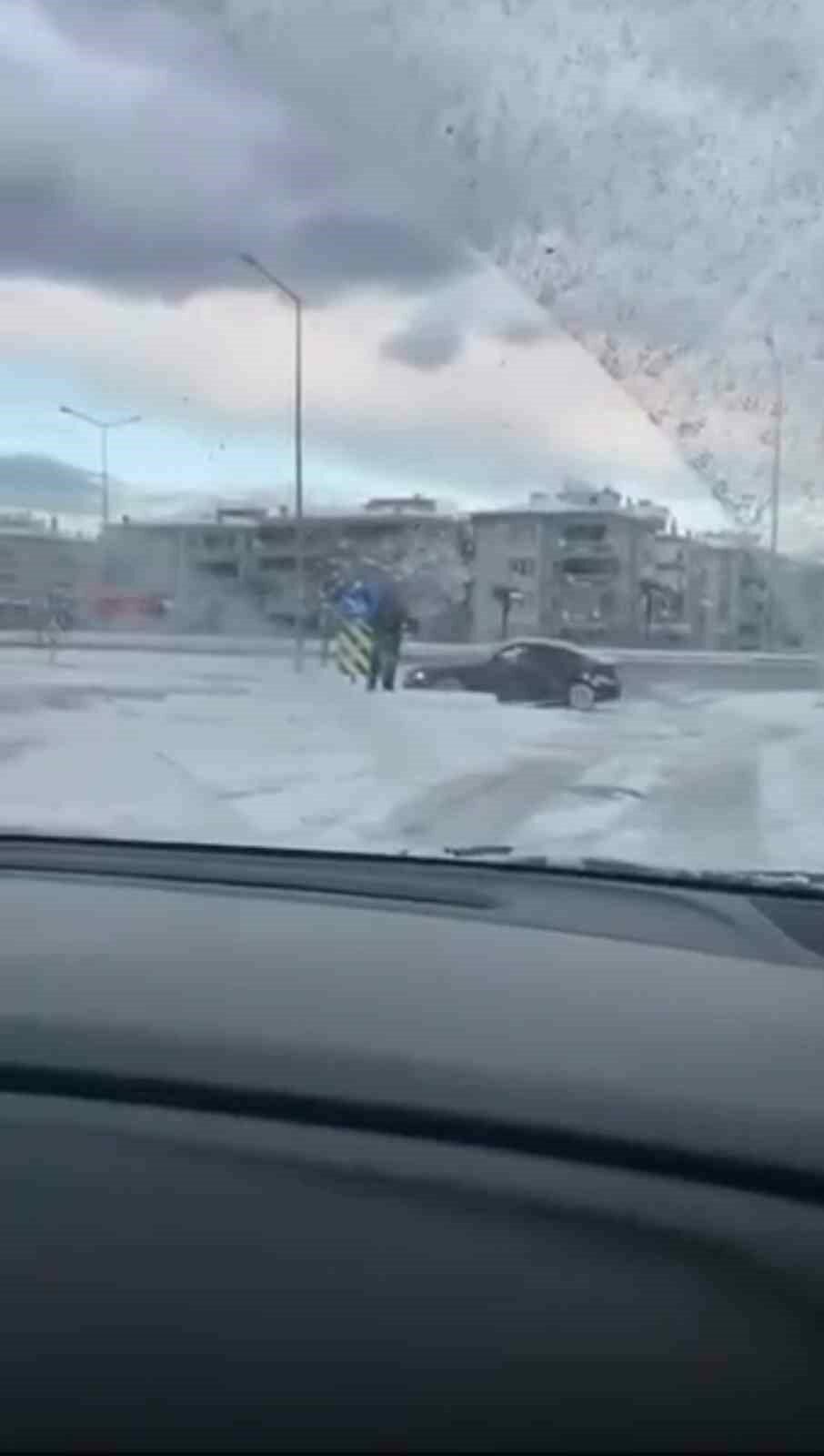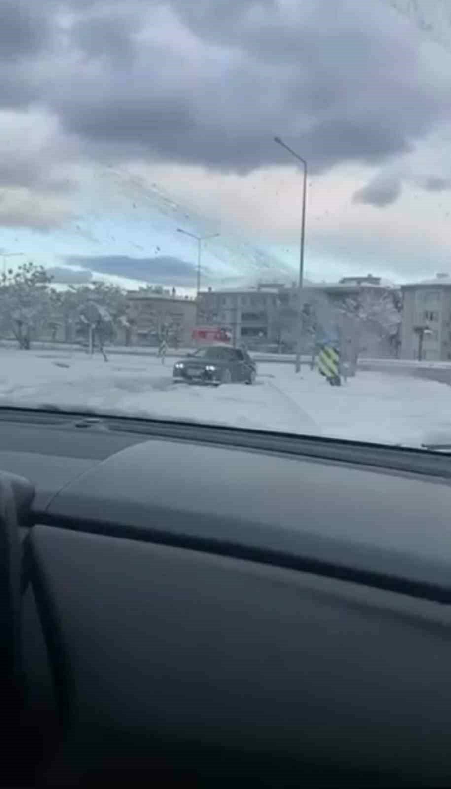 Kar yağışını fırsat bilen bir sürücü, otomobiliyle kavşakta drift atarak trafik güvenliğini hiçe saydı. O anlar çevredeki bir vatandaş tarafından cep telefonu kamerasıyla kaydedildi.