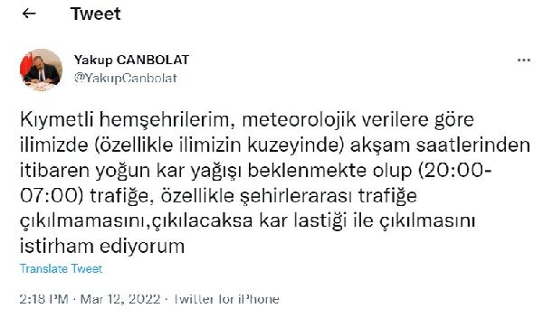 Vali Canbolat, paylaşımında “Kıymetli hemşehrilerim, meteorolojik verilere göre ilimizde akşam saatlerinden itibaren yoğun kar yağışı beklenmekte olup, 20:00-07:00 saatleri arasında trafiğe, özellikle şehirlerarası trafiğe çıkılmamasını, çıkılacaksa kar lastiği ile çıkılmasını istirham ediyorum” ifadelerini kullandı