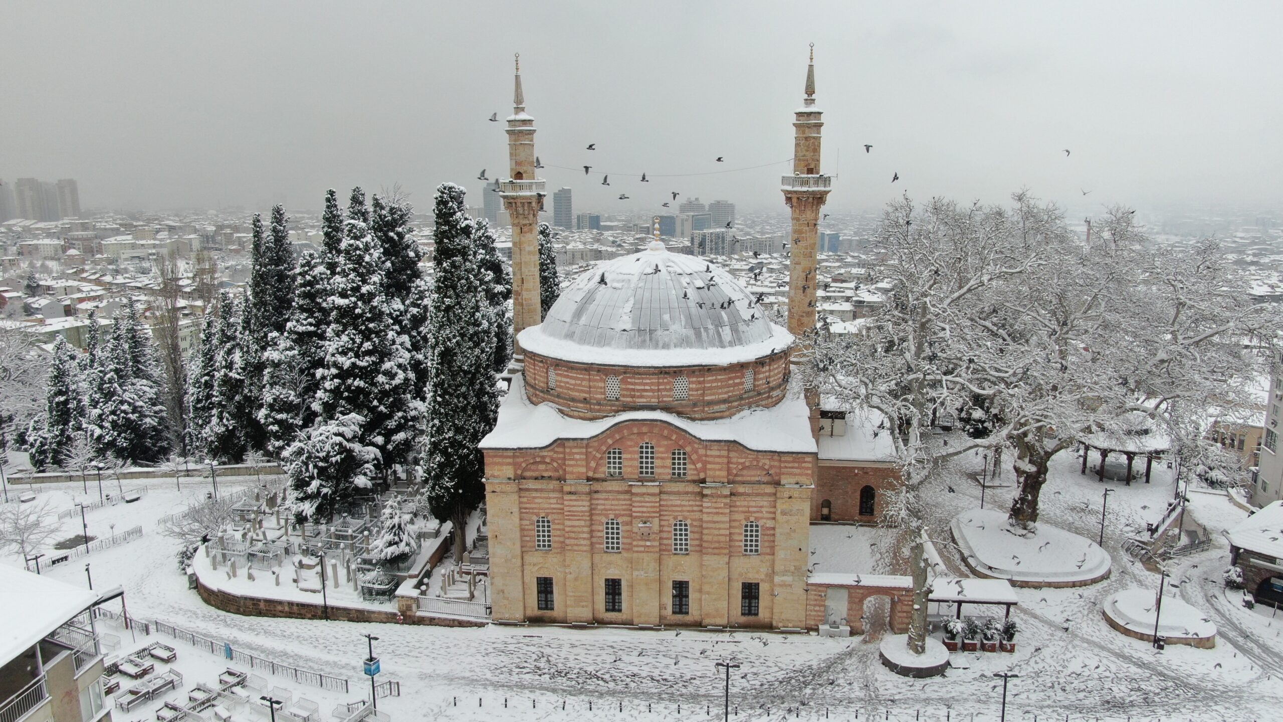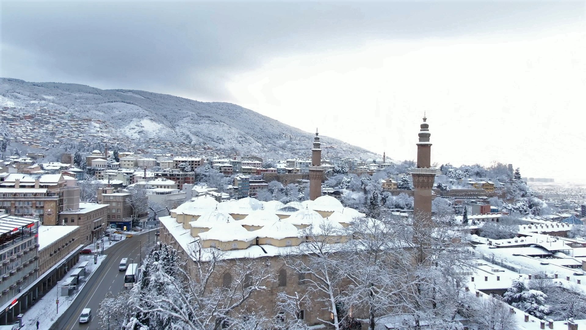 Bursa’da beyaza bürünen tarihi Bursa evleri kartpostalları aratmadı. Uludağ’ın eteklerinde birbirinden farklı renkleriyle cümbüş oluşturan evler havadan böyle görüntülendi. Ulucami, Emirsultan Cami ve Bursa’nın tarihi mekanları kartpostallık görüntüler oluşturdu.