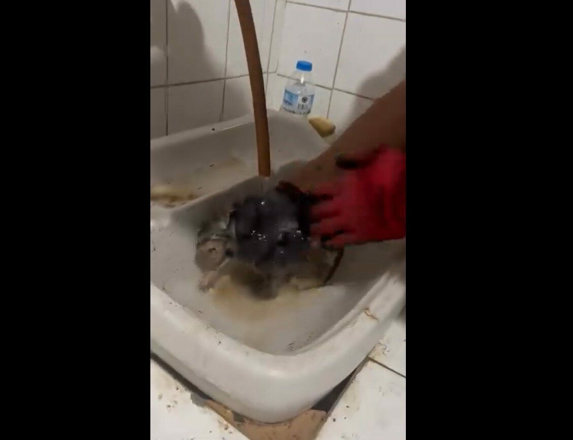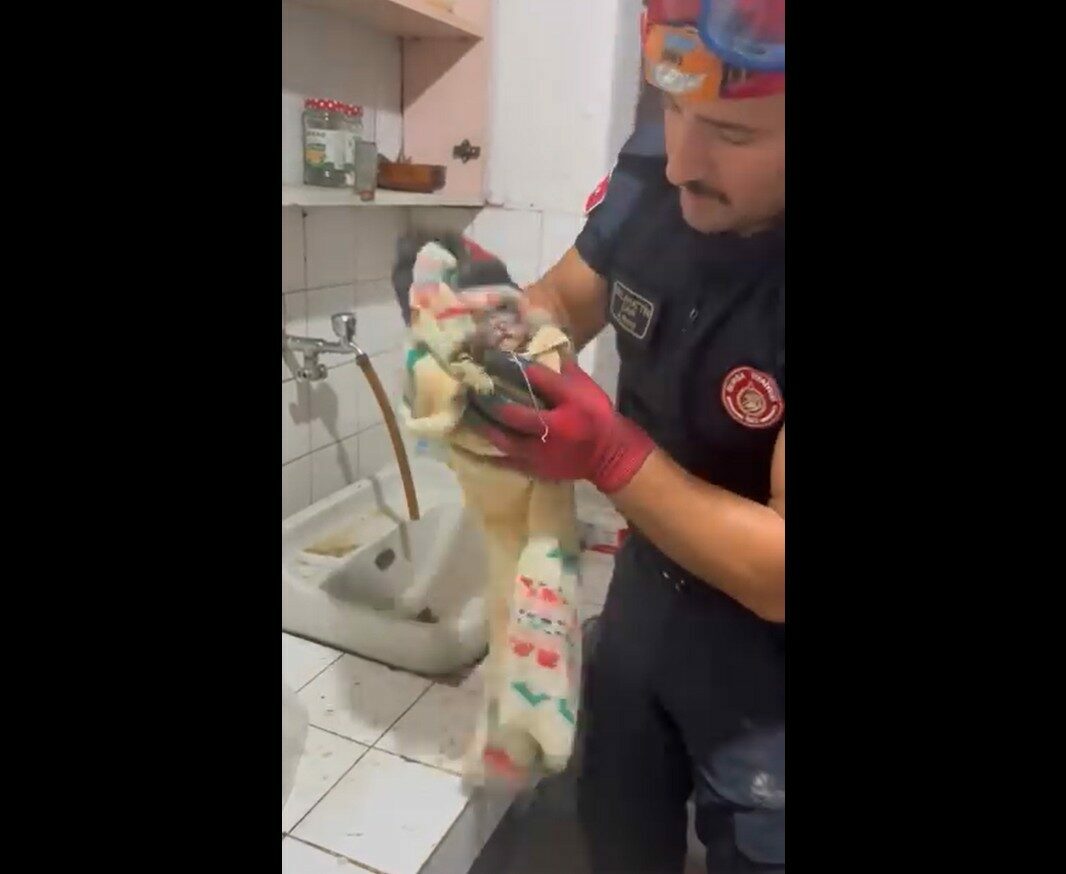 İtfaiye eri, kurtardığı yavru kediyi üzerindeki topraktan arınması için lavaboda yıkayıp, havluyla kuruladı.