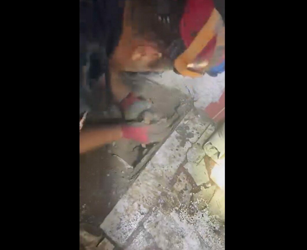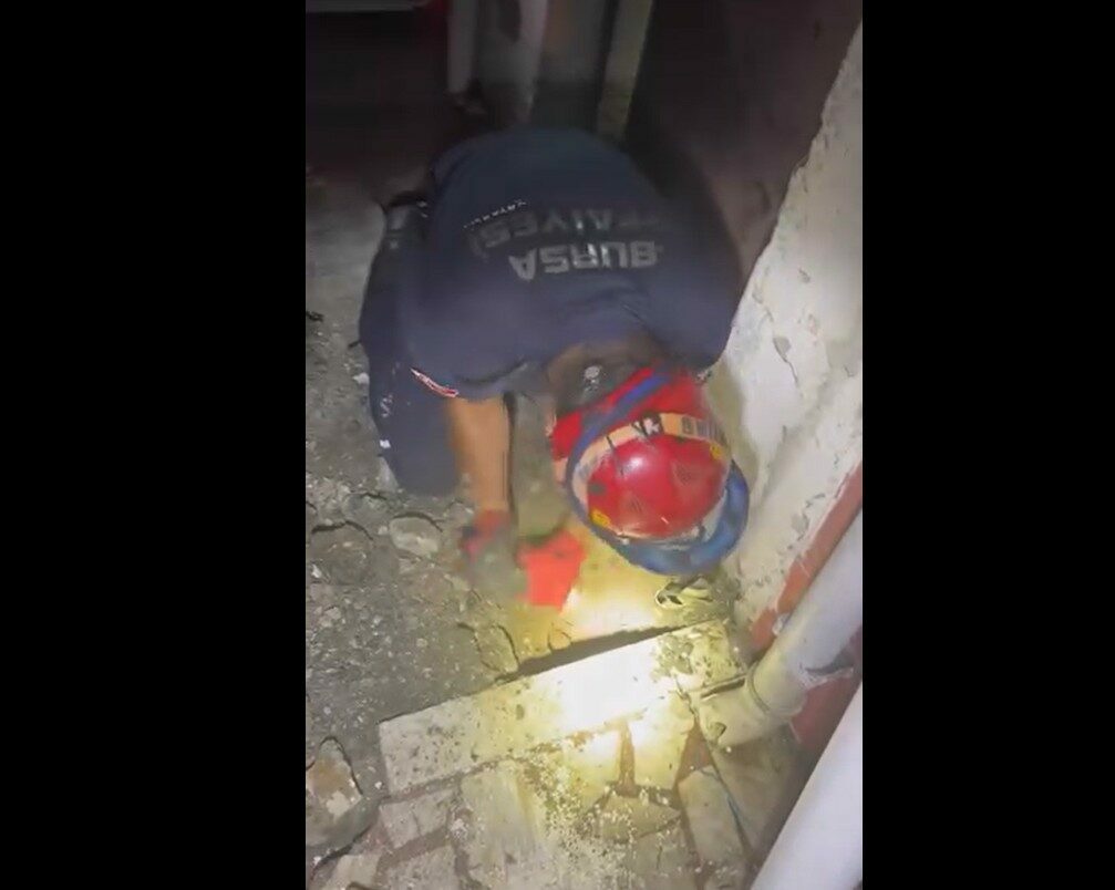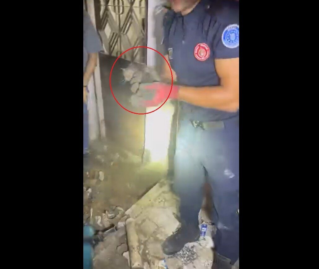 Hilti ile kaldırımdaki betonu delen itfaiye eri, kediye zarar vermemek için elleriyle toprağı kazıp giderdeki yavru kediye ulaştı.