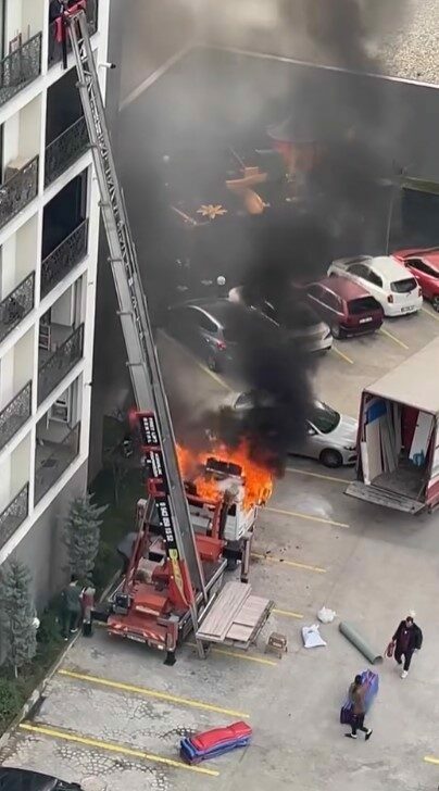 Bir ailenin eşyalarını 6. kattaki dairenin balkonuna çıkarmak için kullanılan eşya taşıma vincinin bağlı olduğu kamyonun kabin kısmında yangın çıktı. Olay kısa sürede site sakinleri arasında paniğe neden oldu. Site içerisinde yoğun duman oluştu. Alev alev yanan vinçli kamyona İlk müdahaleyi ellerinde su dolu damacanalarla çevredeki vatandaşlar yaptı, ardından itfaiye ekipleri yangını kontrol altına aldı. Olayda can kaybı yaşanmazken, kamyonun kabin kısmında maddi hasar meydana geldi. Yangının çıkış nedeni henüz netlik kazanmazken, olayla ilgili inceleme başlatıldı.