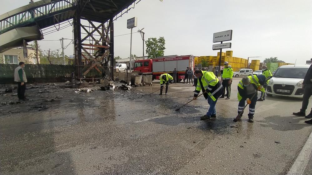 Çevre yolu Bursa istikameti kısa süreli trafiği kapatılırken, itfaiye ekipleri yarım saatlik çalışma sonucu yanan üst geçidi söndürmeyi başardı.