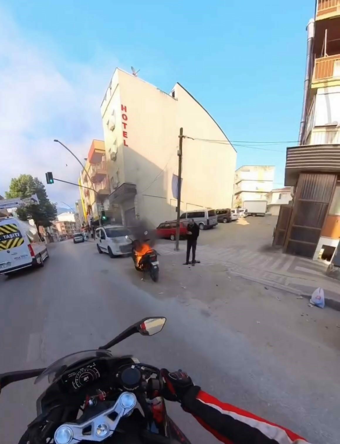 Alevlerin sardığı motoru gören çevredekiler etrafta yangın tüpü ararken, bir vatandaş temizlik kovasına doldurduğu suyla alevlere müdahale etti.