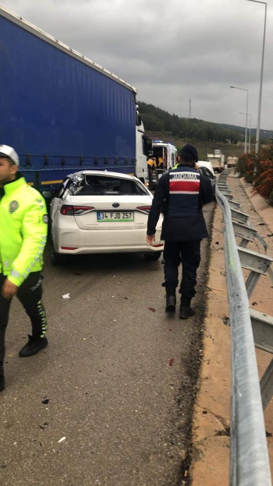 Edinilen bilgiye göre, İnegöl istikametinden Bursa istikametine seyreden V.Y. idaresindeki 77 EES 876 plakalı otomobil yoğun yağış sonucu görüş mesafenin düştüğü ve kayganlaşan yolda viraja girdiği sırada kontrolden çıkarak önce bariyerlere daha sonra aynı istikamette giden K.S. idaresindeki 10 AEE 069 plakalı tıra yandan çarptı.