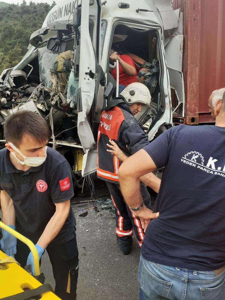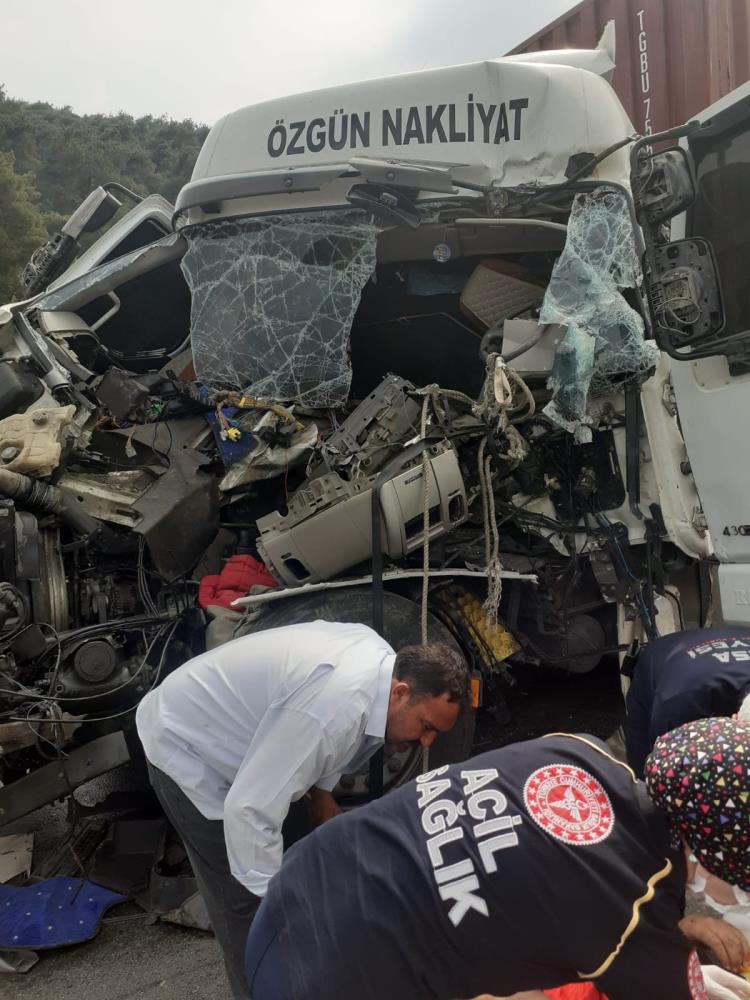 Çarpmanın etkisiyle S.M. tırın içerisinde sıkıştı. 112 Acil Çağrı Merkezi’ne yapılan ihbarla olay yerine itfaiye, sağlık, polis ve Jandarma ekipleri sevk edildi.
