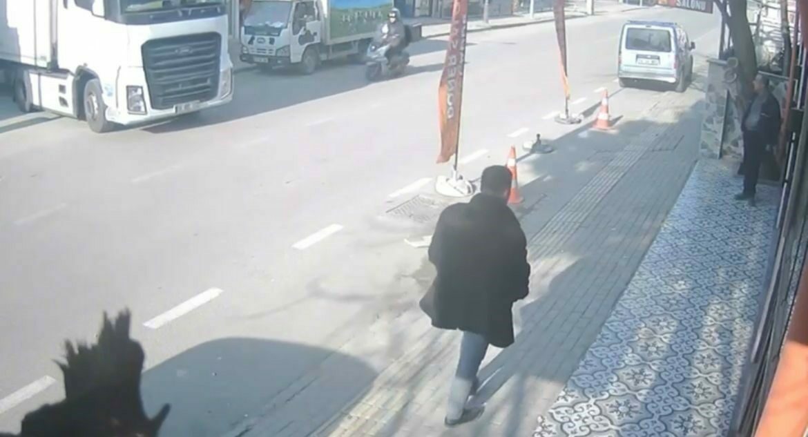 Kazanın şiddetiyle motosiklet sürücü düşerek yaralandı. O anlar çevrede bulunan bir iş yerinin güvenlik kamerasına yansıdı.