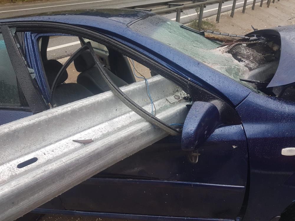 Savrulan araç yolun ortasındaki bariyere çarptı. Yerinden çıkan çelik bariyer aracın önünden girip yanından çıktı.
