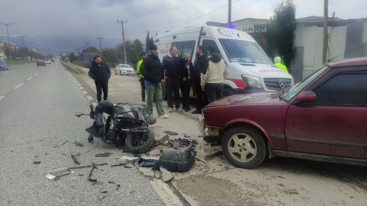 Alınan bilgilere göre, ilçe girişindeki bir akaryakıt istasyonundan ana yola çıkış yapmak isteyen K.A. (68) idaresindeki 11 ABH 962 plakalı Fiat Tofaş Kartal marka otomobile yan yoldan gelen Ö.T. (26) idaresindeki 16 BJM 314 plakalı motosiklet çarptı.