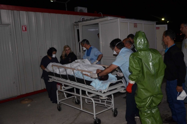 Kimyasal tehlike nedeniyle koruyucu kıyafet giyen ve maske takan hastane personeli, yaralı işçiye özel solüsyonla müdahale etti.