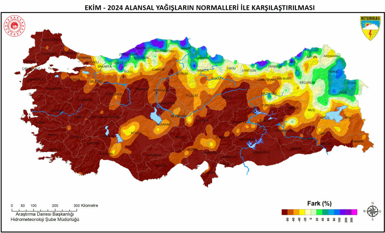 Türkiye genelinde ekim ayı yağışlarının son 6 yıldır normalinin altında gerçekleştiği vurgulanan raporda, ekim ayında yağışların Marmara, Ege, Akdeniz, İç Anadolu bölgelerinin tamamında ve Doğu Anadolu Bölgesi’nin batı ve güney kesimlerinde normallerine göre yüzde 60’ın üzerinde azaldığı ifade edildi. Karadeniz kıyı kesimi, Kars, Ağrı ve Iğdır çevrelerinde ise yer yer yüzde 80’e varan artış gösterdiği açıklandı.