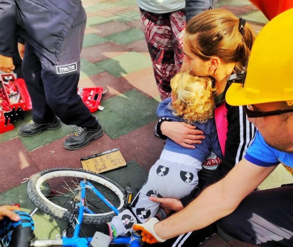Yenişehir ilçesinde arkadaşlarıyla birlikte bisiklet binen minin çocuğun ayağı bisikletine sıkıştı.