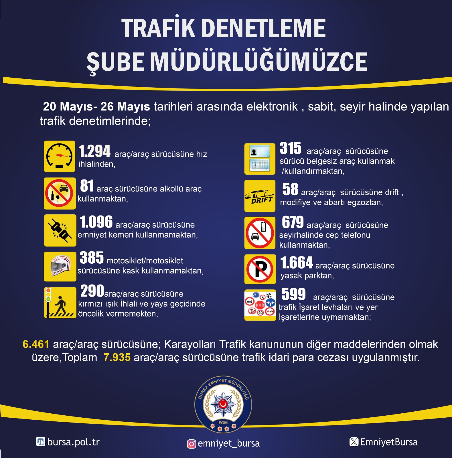 20-26 Mayıs tarihleri arasında yapılan denetimlerde 7 bin 935 araç/araç sürücüsüne idari para cezası uygulandığı belirtildi.