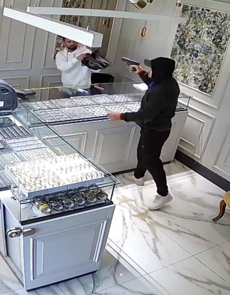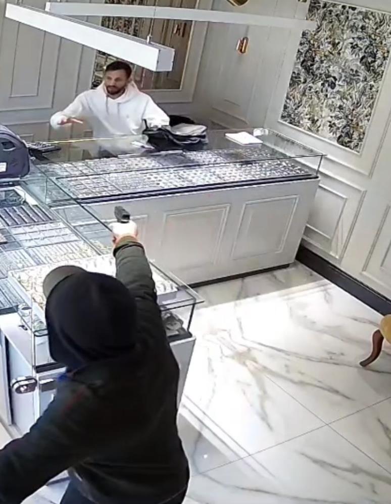 Altınları doldurmasını isteyen kuyumcuyla bağrışan soyguncu, kuyumcunun arka bölümden içeri giren kardeşinin “sakin sakin” demesine aldırmadı.