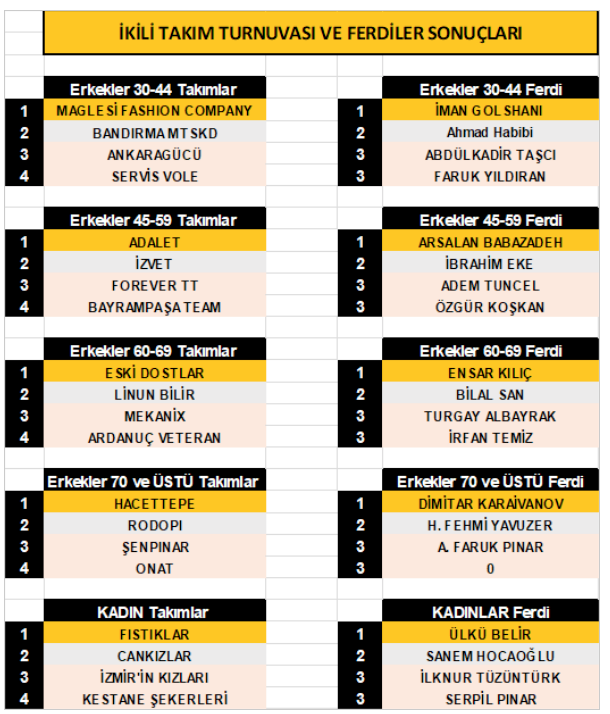Osmangazi Belediyesi Hüdavendigar Kapalı Spor Salonunda ana sponsor Uludağ Premium katkılarıyla, 10 kategoride düzenlenen turnuvada sıralamalar şöyle oluştu: