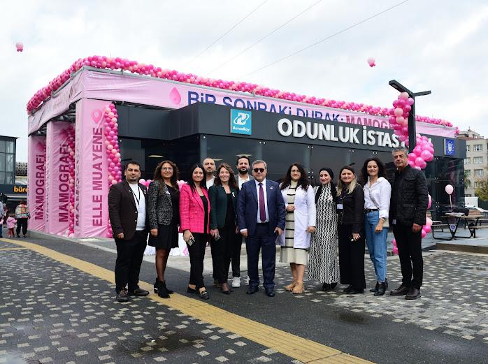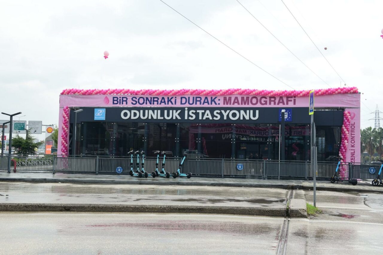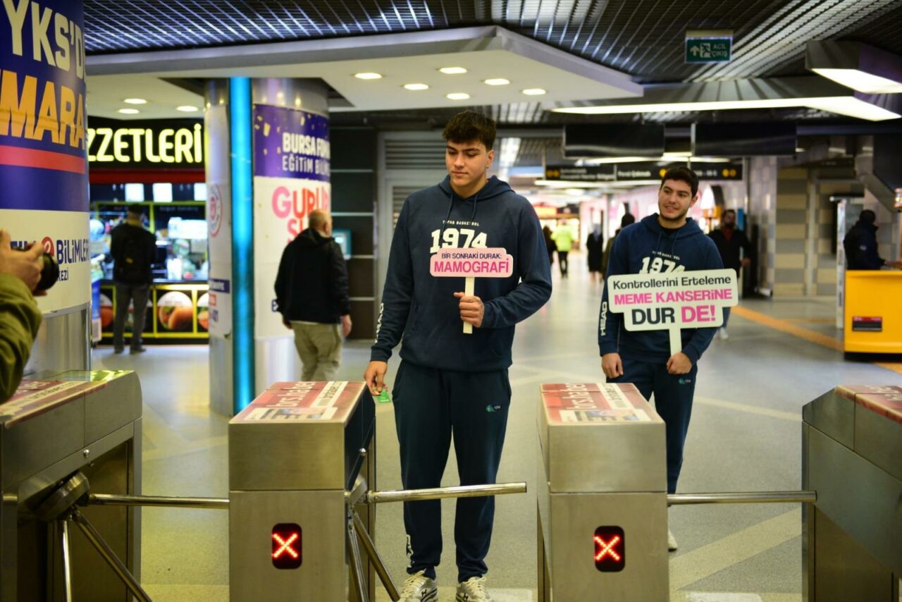 Sabah saatlerinde Odunluk Metro İstasyonu’nu kullanan Bursalılar, istasyonun çevresini süsleyen “Bir Sonraki Durak: Mamografi” temalı görseller ve bilgilendirici mesajlarla karşılaştı. Meme kanserinde erken teşhise giden yolun haritası; kendi kendine meme muayenesi, düzenli hekim kontrolü ve mamografi mesajlarıyla çizildi.