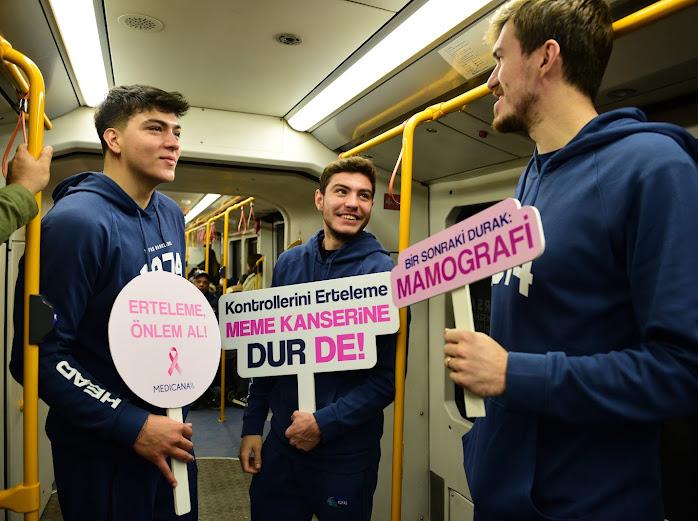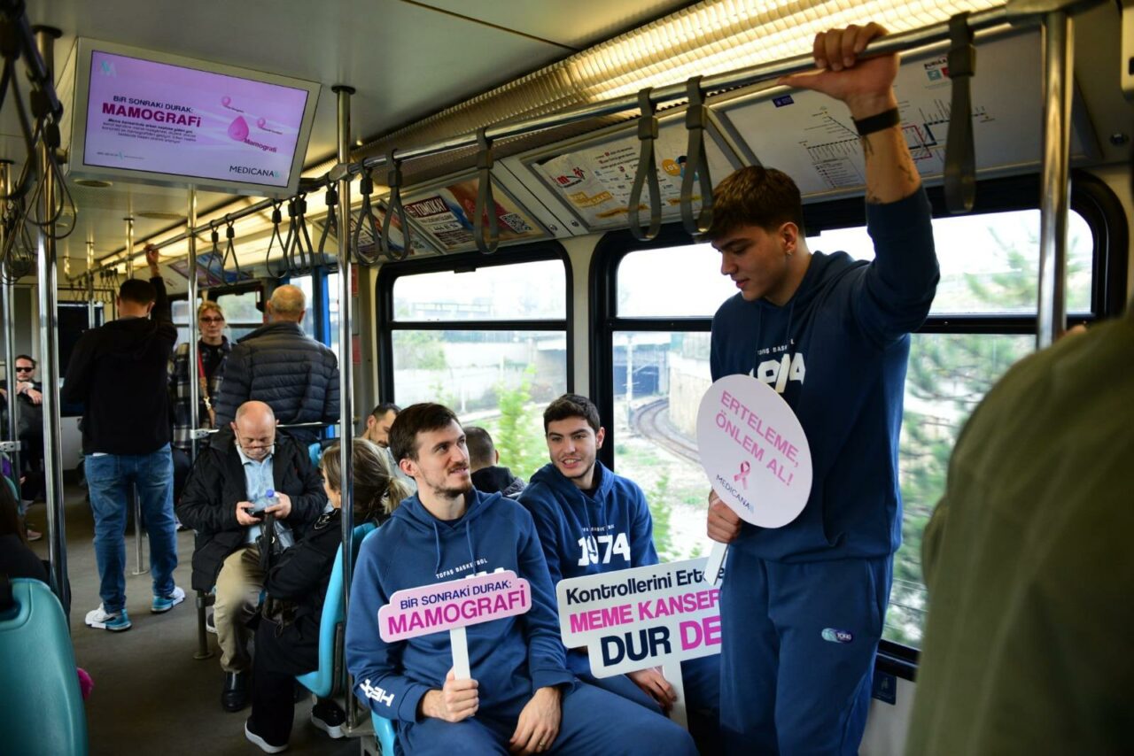 Medicana Bursa Hastanesi ev sahipliğinde, Tofaş Spor Kulübü iş birliğiyle meme kanserinde erken teşhisin önemine dikkat çekmek amacıyla “Bir Sonraki Durak: Mamografi” sloganı altında farkındalık etkinliği gerçekleştirildi. Sporcular, ellerinde erken tanı ve düzenli kontrol mesajlarının yer aldığı pankartlarla Bursa metrosunda yolculuk yaptı. Yolcuların yoğun ilgisini çeken etkinlikte, kendi kendine meme muayenesi, düzenli hekim kontrolü ve mamografinin erken teşhisteki kritik rolü vurgulandı.