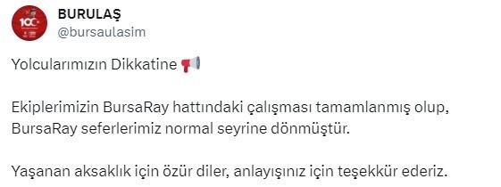 BURULAŞ’ın sosyal medya hesaplarından yapılan açıklamada, “Ekiplerimizin BursaRay hattındaki çalışması tamamlanmış olup, BursaRay seferlerimiz normal seyrine dönmüştür. Yaşanan aksaklık için özür diler, anlayışınız için teşekkür ederiz” denildi.