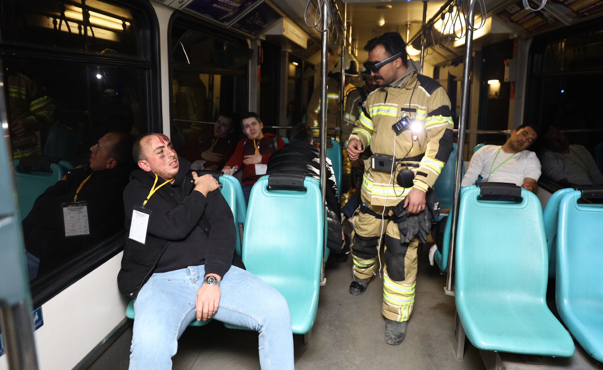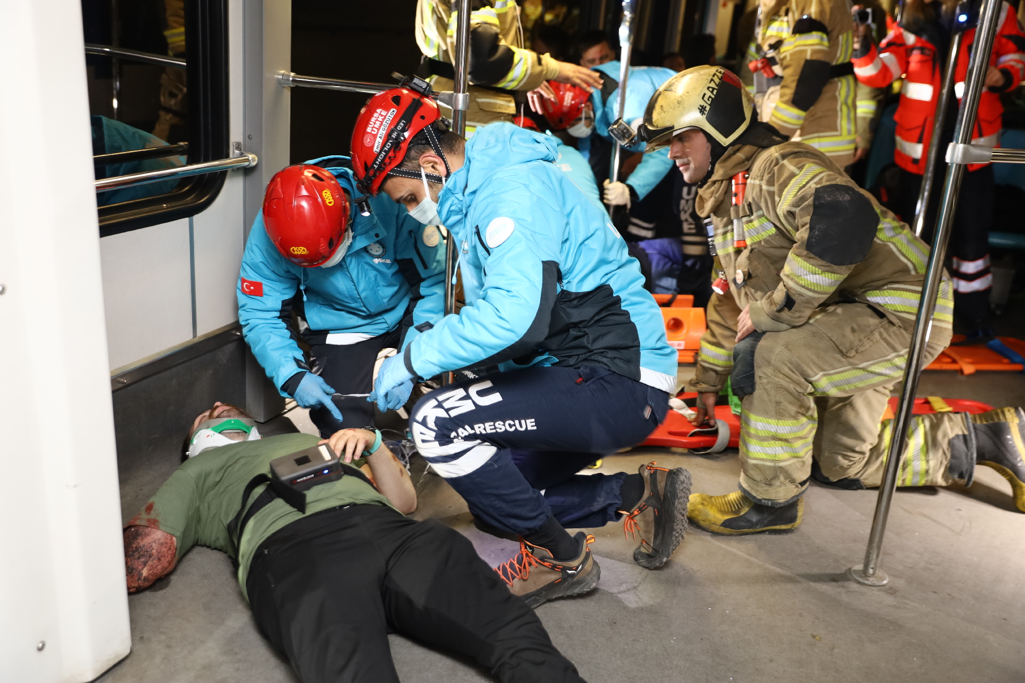 13 ülkeden 80 kişinin üzerinde yabancı uzman, 20 kurum katılımı, HAVELSAN ekibi, UMKE, Bursa Büyükşehir Belediyesi İtfaiye ve Akıllı Şehircilik Dairesi Başkanlıkları ile Burulaş ekiplerinin de katılımıyla 200’ü aşkın personelle kimyasal alan, yangın ve tren kazası tatbikatları gerçekleştirildi. Küçükbalıklı Afet Koordinasyon Merkezi’nde gerçekleştirilen kimyasal alan ve yangın tatbikatları gerçeği aratmazken, tren kazası tatbikatı ise adeta nefesleri kesti. Senaryo gereği metro, Nilüfer İstasyonu ile Odunluk İstasyonu arasındaki tünelden geçerken, deprem meydana geldi ve metro vagonu raylardan çıktı. Metrodaki yolculardan 21’i yaralanırken, olay yerine gelen ekipler, olaya son teknolojik donanımlarla müdahale etti. Müdahale ekipleri giyilebilir teknolojilerle donatılırken, ilk olarak olay yerine bir drone yönlendirildi. Olay yeri ve yaralı tespitleri öncelikle drone ile yapıldı. Bu tespitin ardından yürüyebilecek durumdaki yolcular, raylar üzerinde çıkış noktasına yönlendirilirken, müdahale ekipleri de vagona girerek içerideki yaralılarda durum tespiti yaptı. Bu tespit ekiplerin özel gözlükleri sayesinde kriz merkezinden de anlık takip edildi. Bu gözlem ve tespitlerin ardından da devreye UMKE ekipleri girdi. Yaralılara ilk müdahaleyi vagon içinde yapan ekipler, termal battaniyeye sardıkları yaralıları sedye ile raylar üzerinde istasyona kadar taşıdı. Yaklaşık 3 saat süren tatbikat, başarıyla tamamlandı.