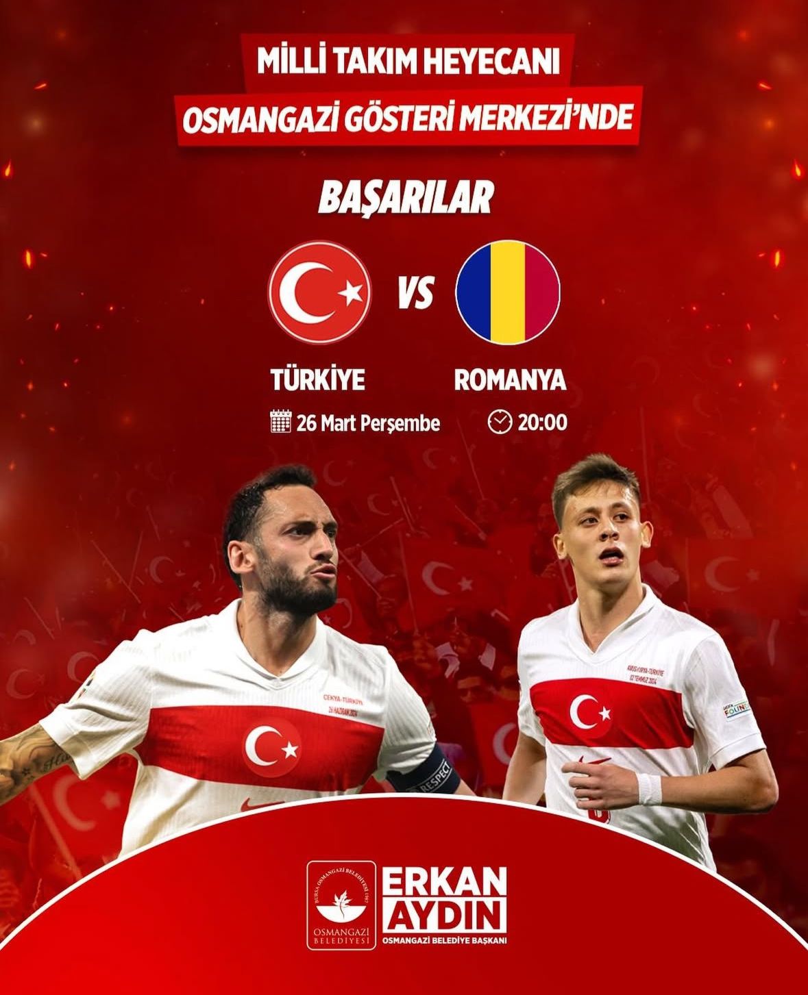 Dünya Kupası yolunda büyük önem taşıyan Türkiye – Romanya play-off mücadelesi, 26 Mart Perşembe günü saat 20.00’de Osmangazi Gösteri Merkezi’nde kurulacak dev ekranda yayınlanacak. Belediye tarafından yapılan çağrıda, tüm Bursalılar bu heyecana ortak olmaya davet edildi.