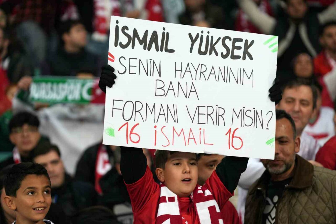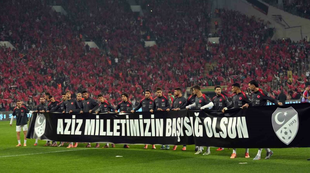 Milli futbolcular da ısınmada sahaya “Aziz Milletimizin Başı Sağ Olsun” yazılı pankartla çıktı.
