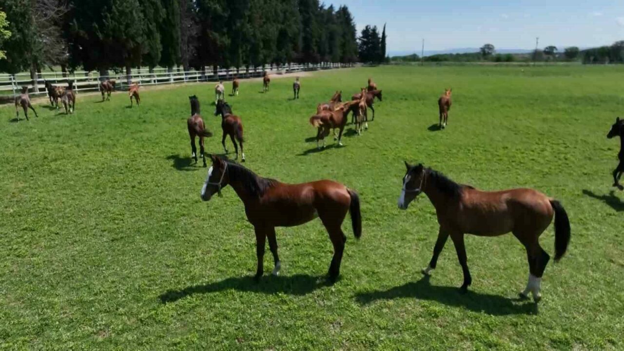Bugün pistlerde koşan Arap atlarının yarısından fazlasını yetiştiren işletmede büyük bir titizlikle yetiştirilen Türk Arap atları drone ile görüntülendi. Her gün belli saatlerde açık alana salınan atların enerjilerini atmaları, koşuşturmaları ve birbirleriyle oynaşmaları görüntülere yansıdı.