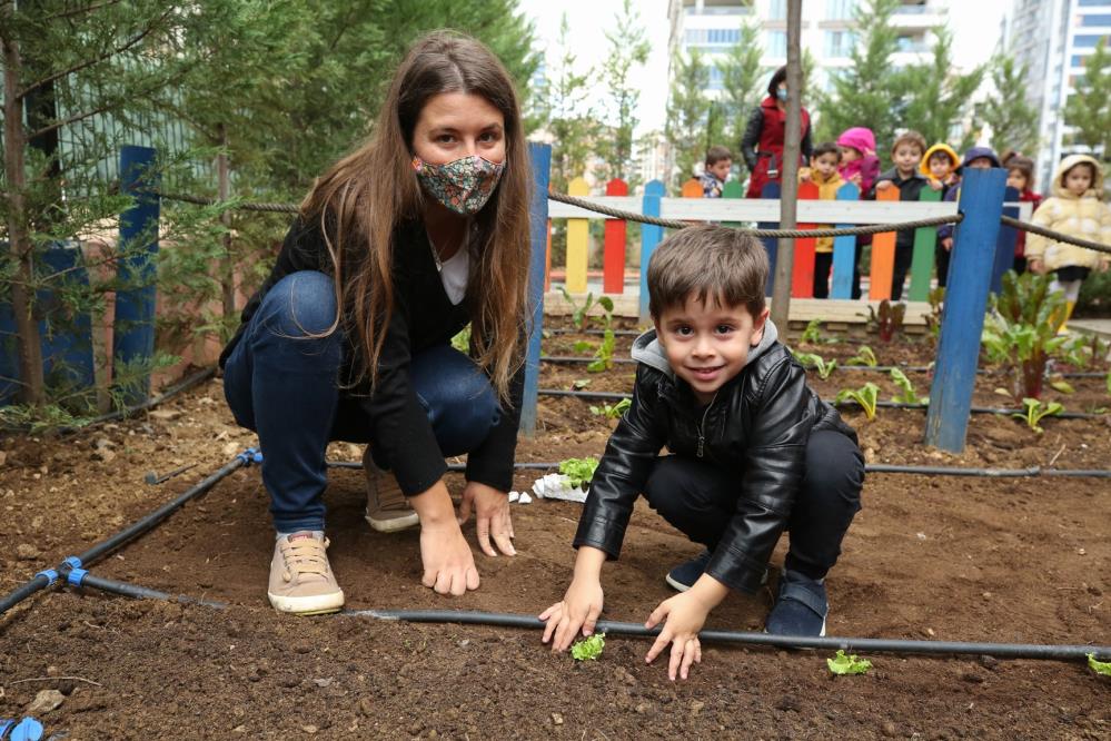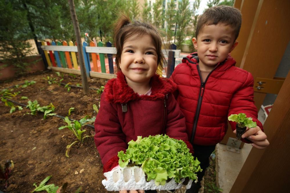 Öğrenciler, daha sonra, Nilüfer Belediyesi Burak Berk Kreşi ile Çamlıca Kreşi’nin bahçesinde oluşturdukları mini bostanda, pazı ve marul fideleri kendi elleriyle dikerek, turp, tere, bakla, ıspanak, havuç, bezelye, roka ve maydanoz gibi sebzelerin tohumlarını toprakla buluşturdu.