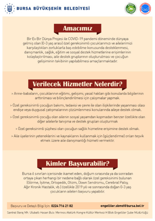 Danışmanlık, sağlık, eğitim ve sosyal destek hizmetlerine erişimleri de kolaylaşırken, çocukların gelişiminin takibi de yapılıyor. Projeye, Bursa’da ikamet eden ve özel gereksinimi bulunan 0-3 yaş aralığındaki çocukların aileleri 0224 716 21 82 nolu telefondan veya [email protected] adresine mail atarak başvuru yapabiliyor.
