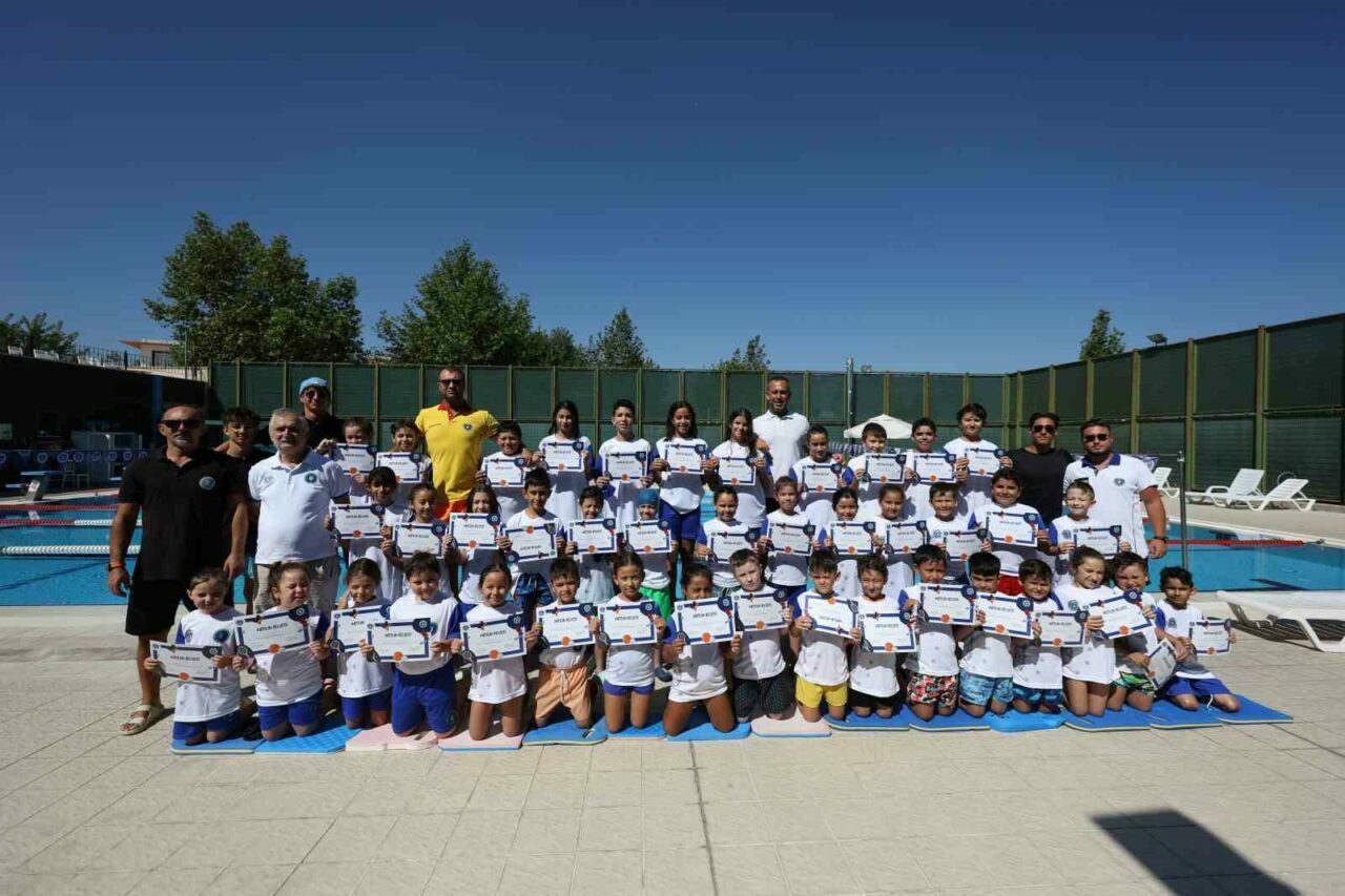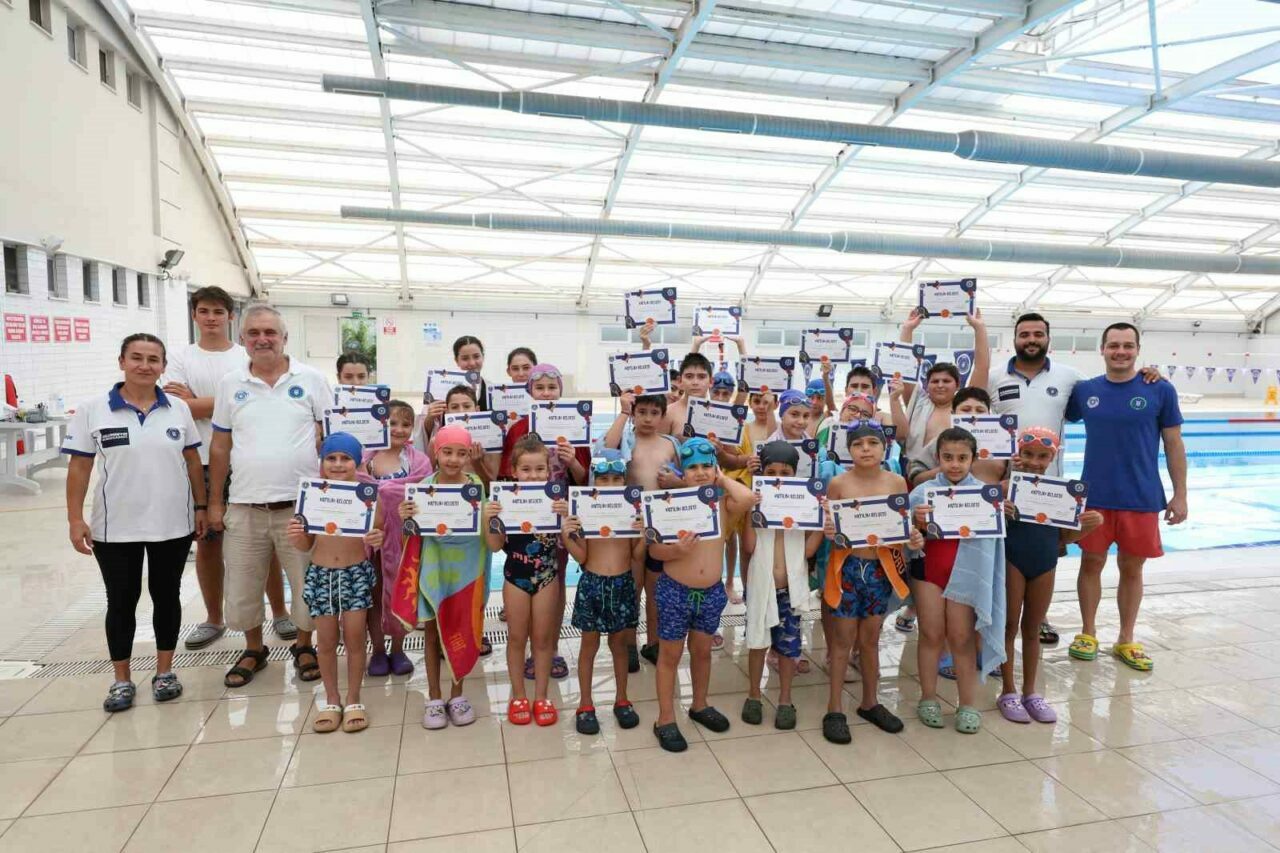 Yüzme kurslarında 6-13 yaş aralığındaki çocuklar eğitim alırken, minik kulaçlar dönem sonunda sertifikalarına kavuşmanın mutluluğunu yaşadı.
