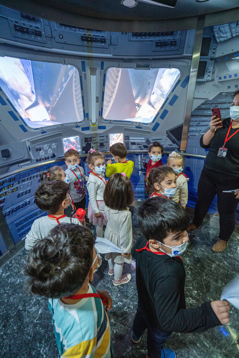 Yaş sınırı olmayan GUHEM’e gelen 7 yaşından 70 yaşına kadar herkesin burayı gezmek için en az iki saatini ayırması gerekiyor. Ziyaretçiler, 2’nci katta bulunan Uzay İstasyonu bölümüne, uzay kapsülü şeklinde tasarlanan çok özel asansör ile çıkıyor. Kendilerini uzay yolculunda sanan misafirler asansörden inince, ‘Dünyaya hoş geldiniz’ diye espri yapılıyor. Uzay İstasyonu bölümüne gelenler, astronomi ve Mars bölümünü ziyaret ederek havacılıktan sonra astronomi ile ilgili bilgi sahibi oluyorlar.