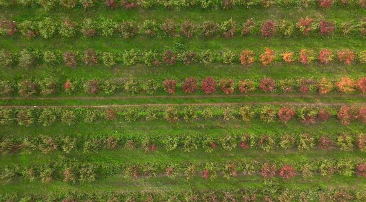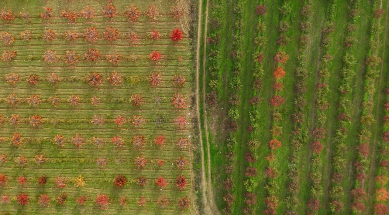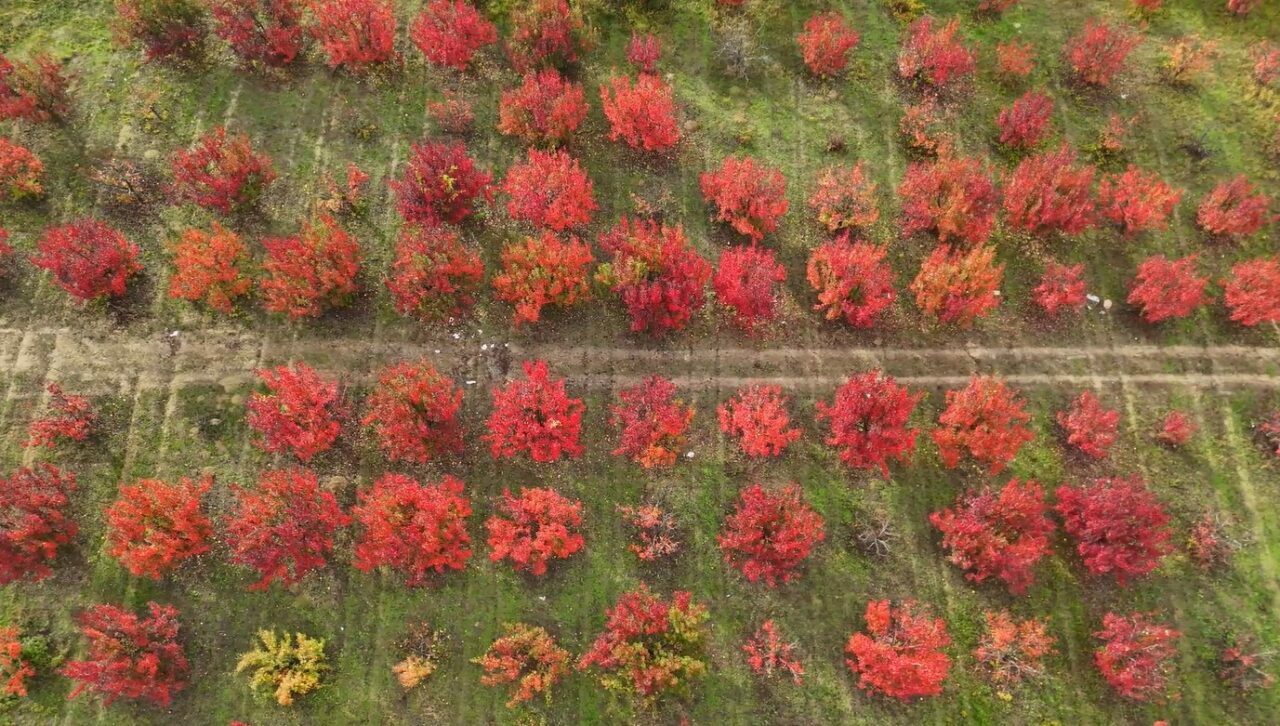 Santa Maria cinsi armut, şeftali ve elma bahçelerindeki renk cümbüşü, drone ile görüntülendi.