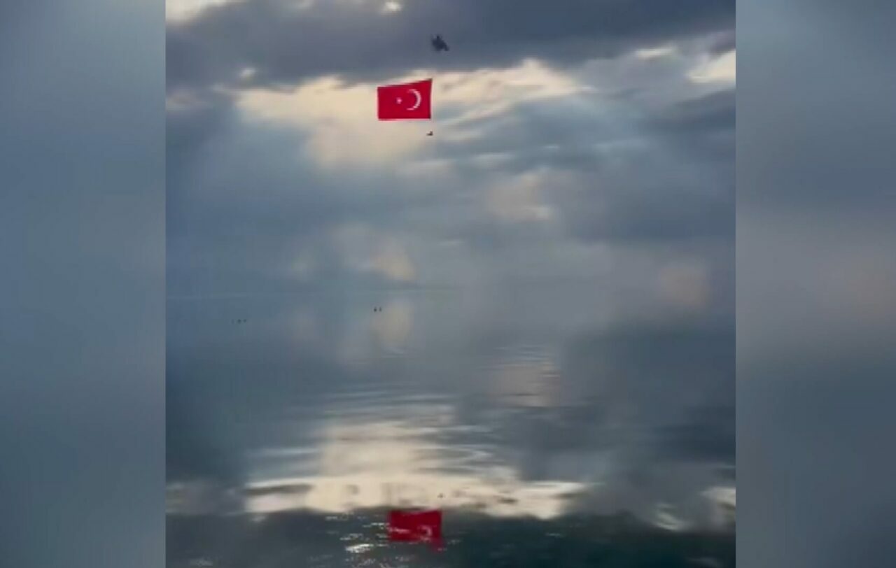 THK gösteri pilotu ve yamaç paraşütü öğretmeni Ömer Faruk Karaoğlan, taşıdığı dev Türk bayrağıyla göl ve tarihi surlar üzerinde uçtu. Güneş batarken gerçekleşen gösteride hüzme oluştu ve bayrağın suya yansıması dikkat çekti.