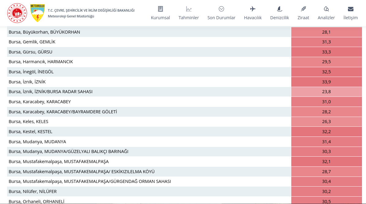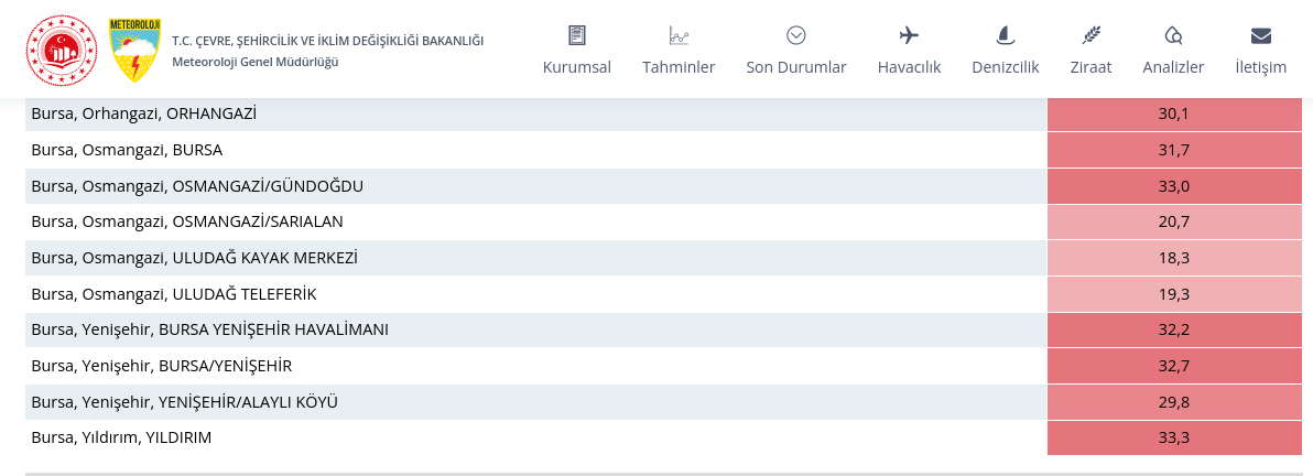 İŞTE 2 NİSAN’DA BURSA VE İLÇELERİNDE ÖLÇÜLEN HAVA SICAKLIKLARI