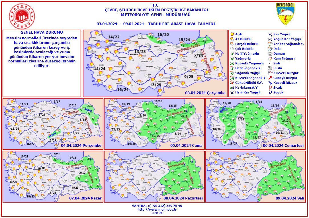 Türkiye geneli için haftalık hava tahminleri şöyle;