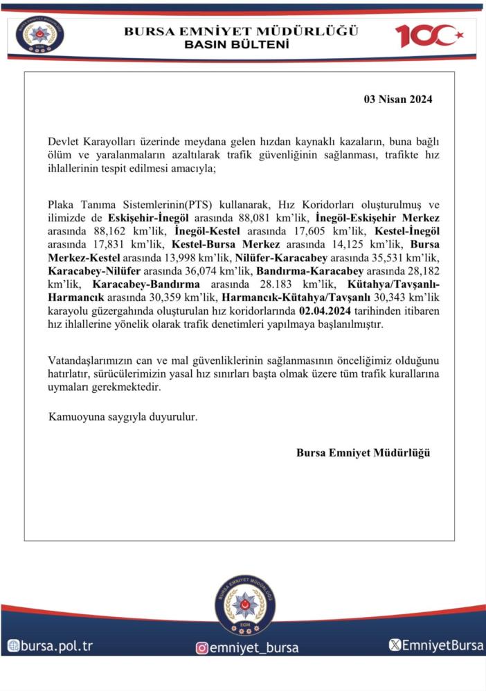 İl Emniyet Müdürlüğü’nden yapılan açıklamada; “Bursa’da, Eskişehir-İnegöl arasında 88.081 kilometrelik, İnegöl-Eskişehir Merkez arasında 88,162 kilometrelik, İnegöl-Kestel arasında 17,605 kilometrelik, Kestel-İnegöl arasında 17,831 kilometrelik, Kestel-Bursa Merkez arasında 14,125 kilometrelik, Bursa-Kestel arasında 13,998 kilometrelik, Nilüfer-Karacabey arasında 35,531 kilometrelik, Karacabey – Nilüfer arasında 36,074 kilometrelik, Bandırma-Karacabey arasında 28,182 kilometrelik, Karacabey-Bandırma arasında 28,183 kilometrelik, Kütahya/Tavşanlı-Harmancık arasında 30,359 kilometrelik, Harmancık-Kütahya/Tavşanlı 30,343 kilometrelik karayolu güzergahında oluşturulan hız koridorlarında hız ihlallerine yönelik trafik denetimleri yapılmaya başlanmıştır. Vatandaşlarımızın can ve mal güvenliklerinin sağlanmasının önceliğimiz olduğunu hatırlatır, sürücülerimizin yasal hız sınırları başta olmak üzere tüm trafik kurallarına uymaları gerekmektedir” dedi.