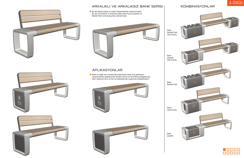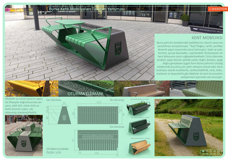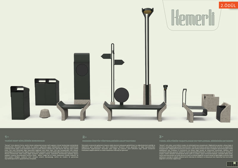 Büyükşehir Belediyesi Kentsel Tasarım Şube Müdürlüğü tarafından düzenlenen toplam 280 bin TL ödüllü yarışmaya teslim edilen 49 proje, Prof. Dr. Tülin Vural Arslan, Prof. Dr. Gül Sayan Atanur, Doç. Dr. Onur Mengi, Haluk Seyrek, Sertaç Ersayın, İsa Eren Akbıyık ve Emel Baş’tan oluşan jüri tarafından titizlikle değerlendirildi. Yenilikçi, ayırt edilebilir, bulunduğu yerin dokusuyla uyumlu, işlevsellik, dayanıklılık, erişilebilirlik, üretilebilirlik, çevresel faktörleri gözeten, sürdürülebilir, depolama ve lojistik kolaylık kriterlerine göre değerlendirilen projelerden Yunus Emre Alaç, Sefa Çelik, Mehmet Köhserli, Nagehan Vanlıoğlu, Yılmaz Değer ve Enes Demir’den oluşan ekibin hazırladığı proje birinci oldu. İkincilik ödülü Yaprak Deniz Yurt ve Elif Kadayıf’ın projesi ikinci seçilirken, üçüncülük ödülü ise Mustafa Fırat Ant’ın oldu.