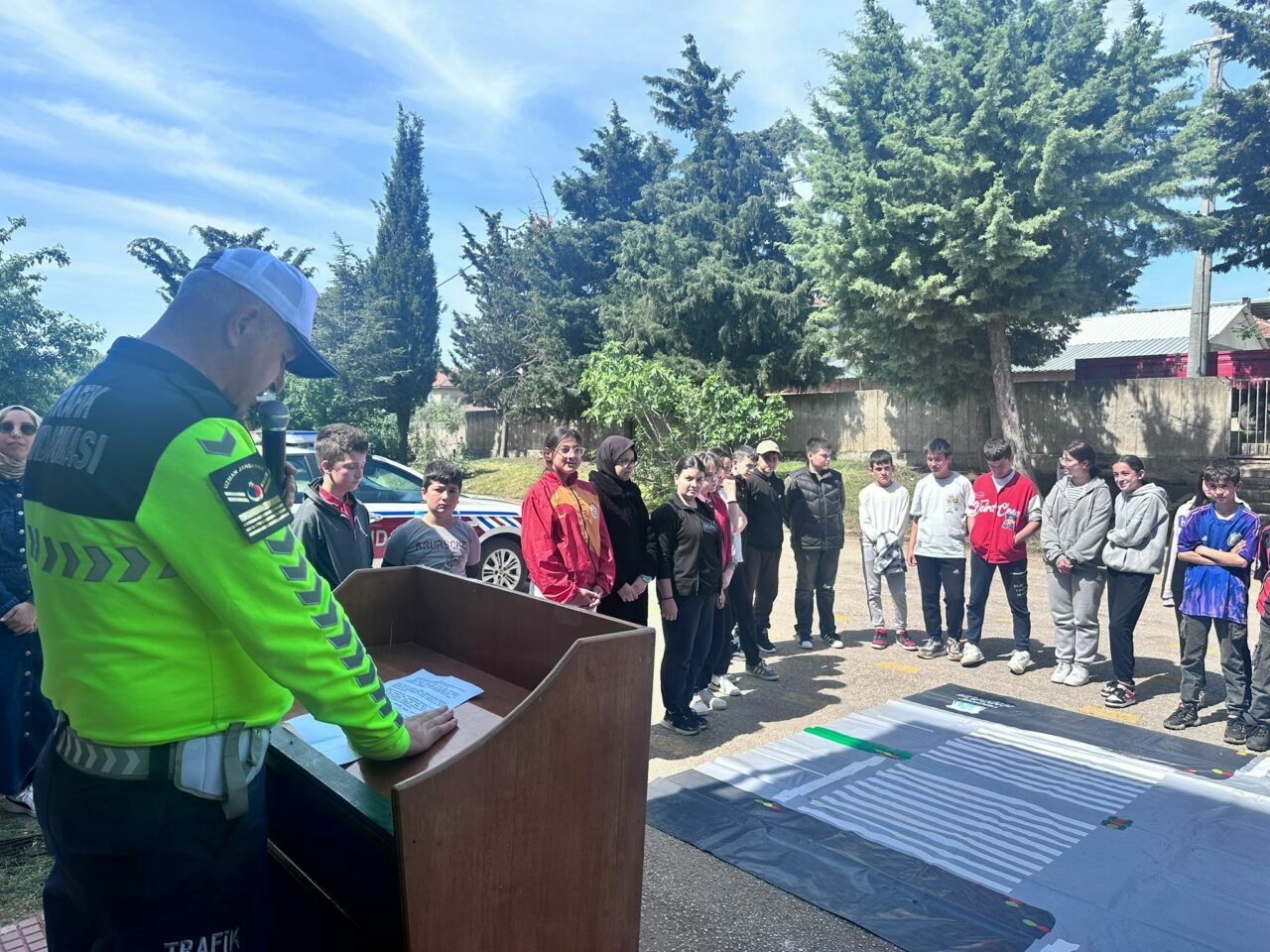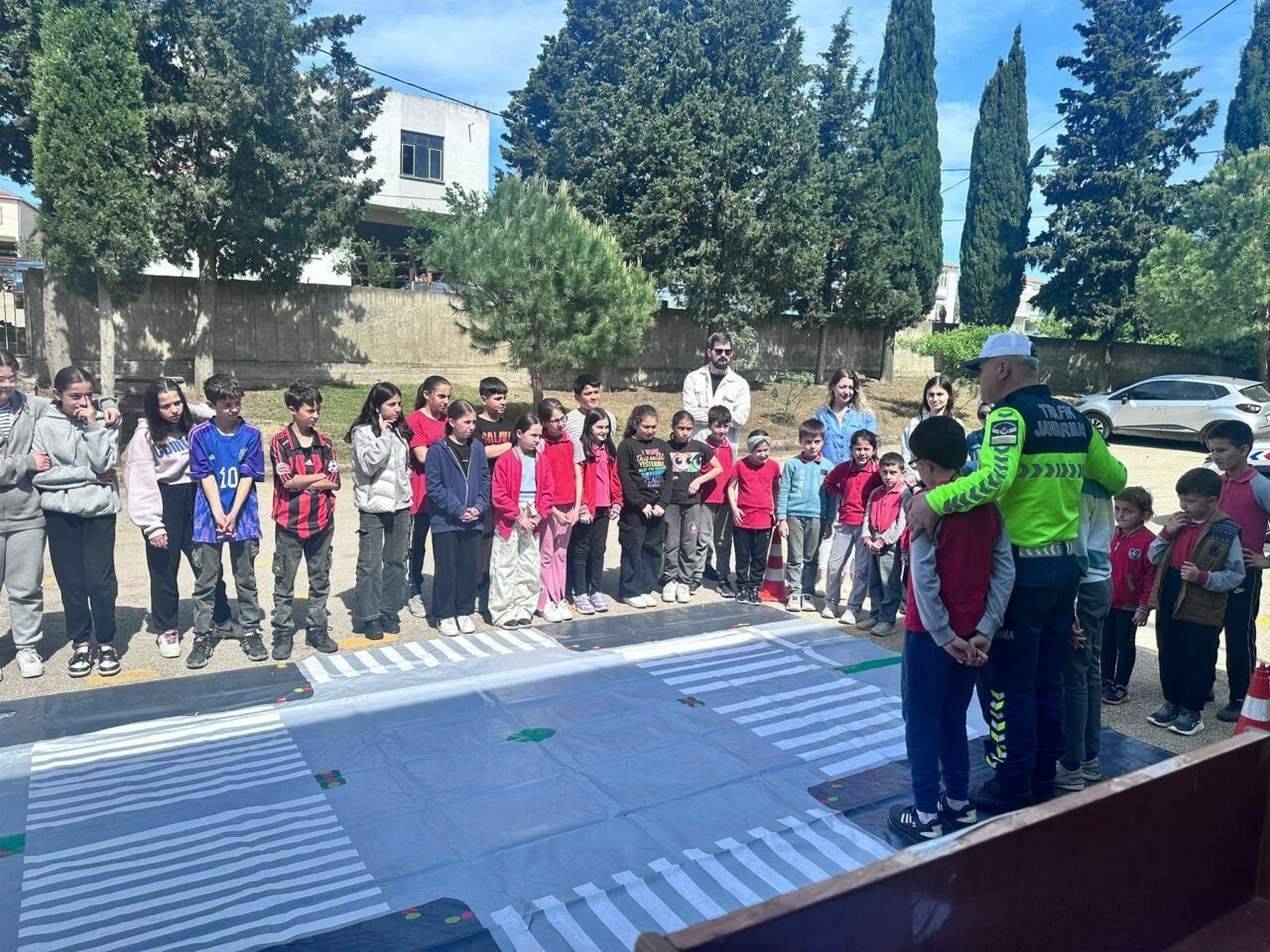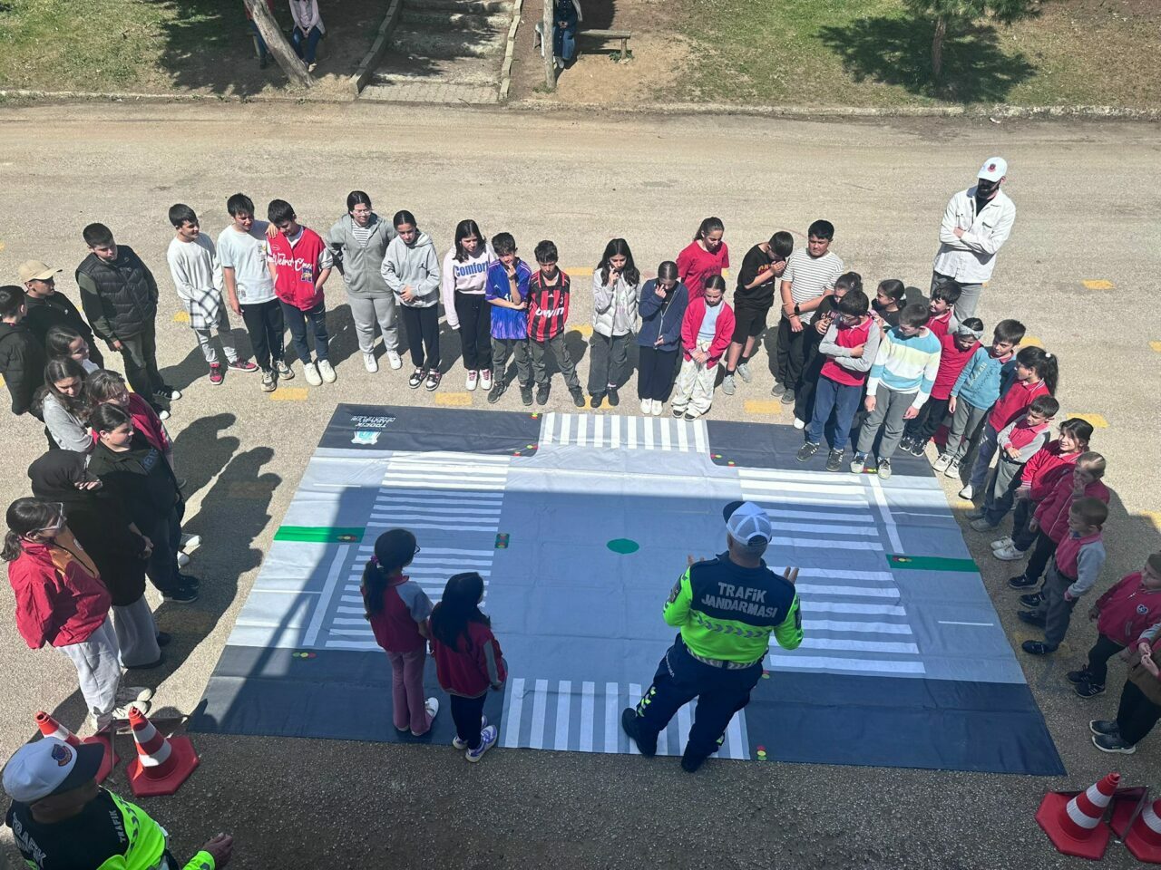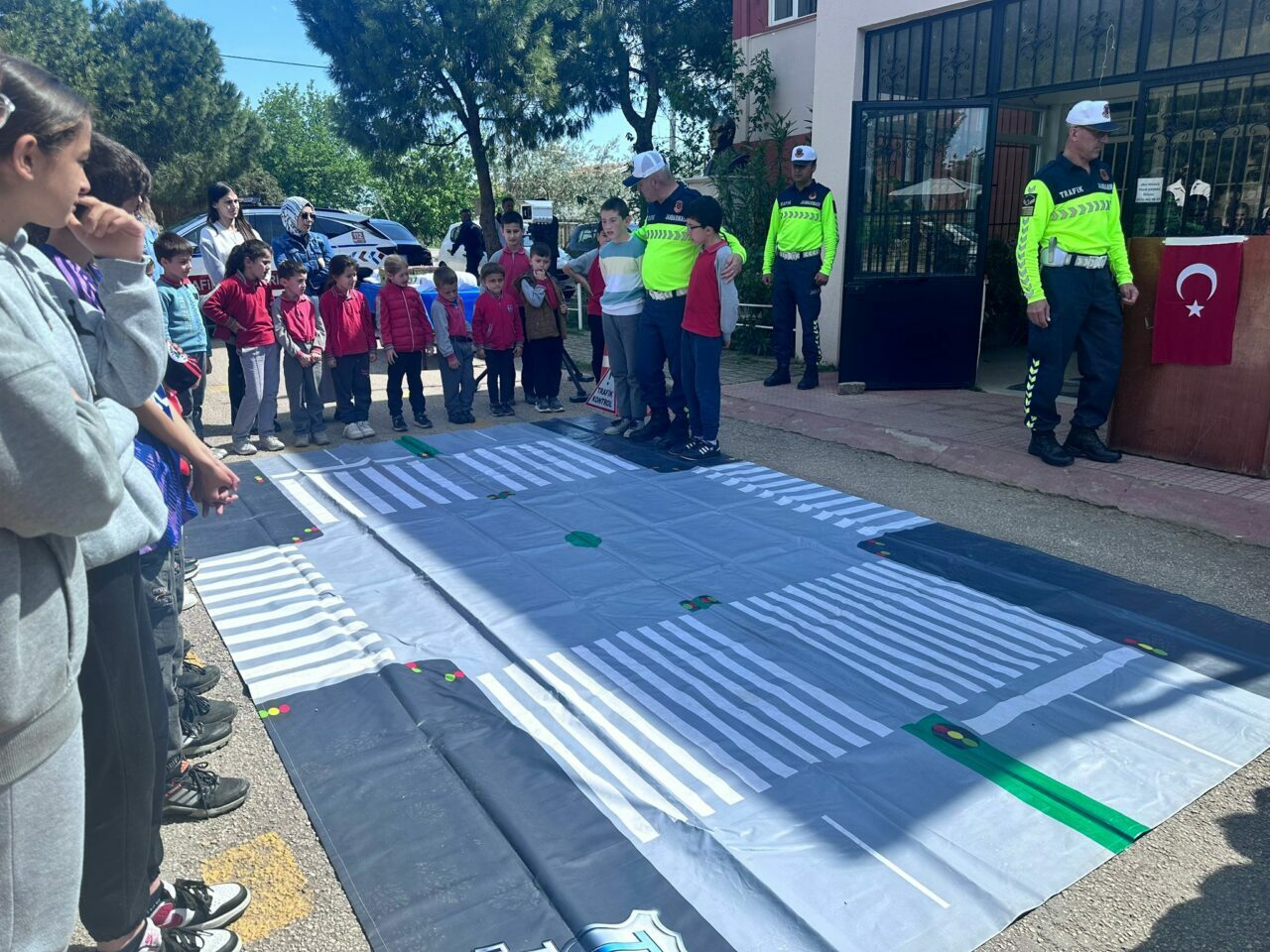Trafik güvenliği hakkında bilgi sahibi olunmasının öneminin de anlatıldığı etkinlikte, çocuklar okul bahçesinde trafik jandarma ekiplerinin malzemelerini tanıdı.